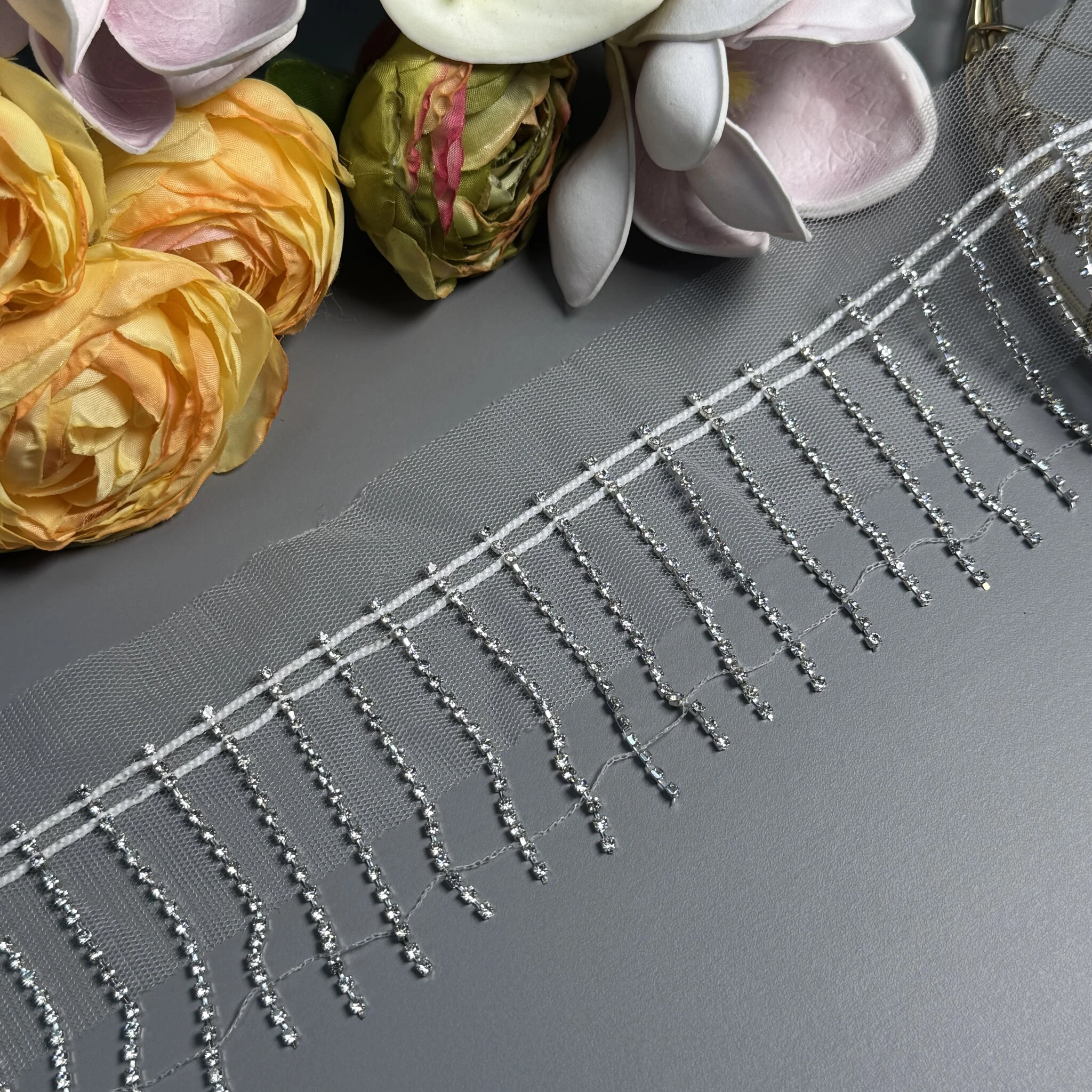 Бахрома з камінням та кульками 6 см (25 м), білий підійде для пошиття одягу, декору, білизни, аксесуарів та творчих проєктів. Допоможемо з підбором суміжних позицій і кольорів.