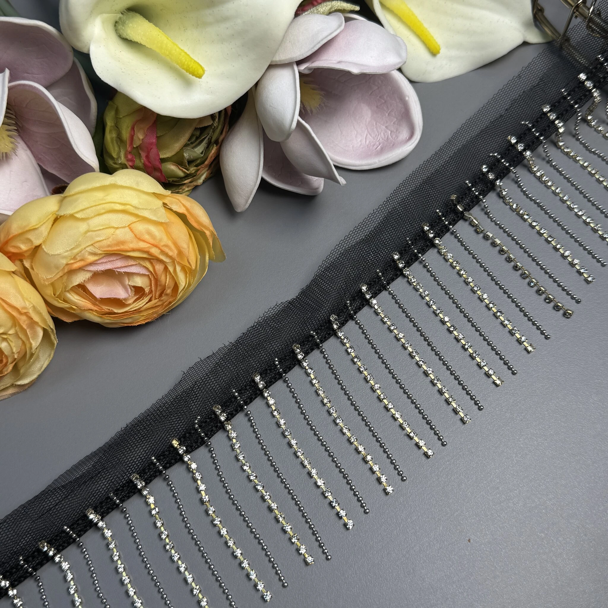 Бахрома з камінням та кульками 6 см (25 м), чорний підійде для пошиття одягу, декору, білизни, аксесуарів та творчих проєктів. Допоможемо з підбором суміжних позицій і кольорів.
