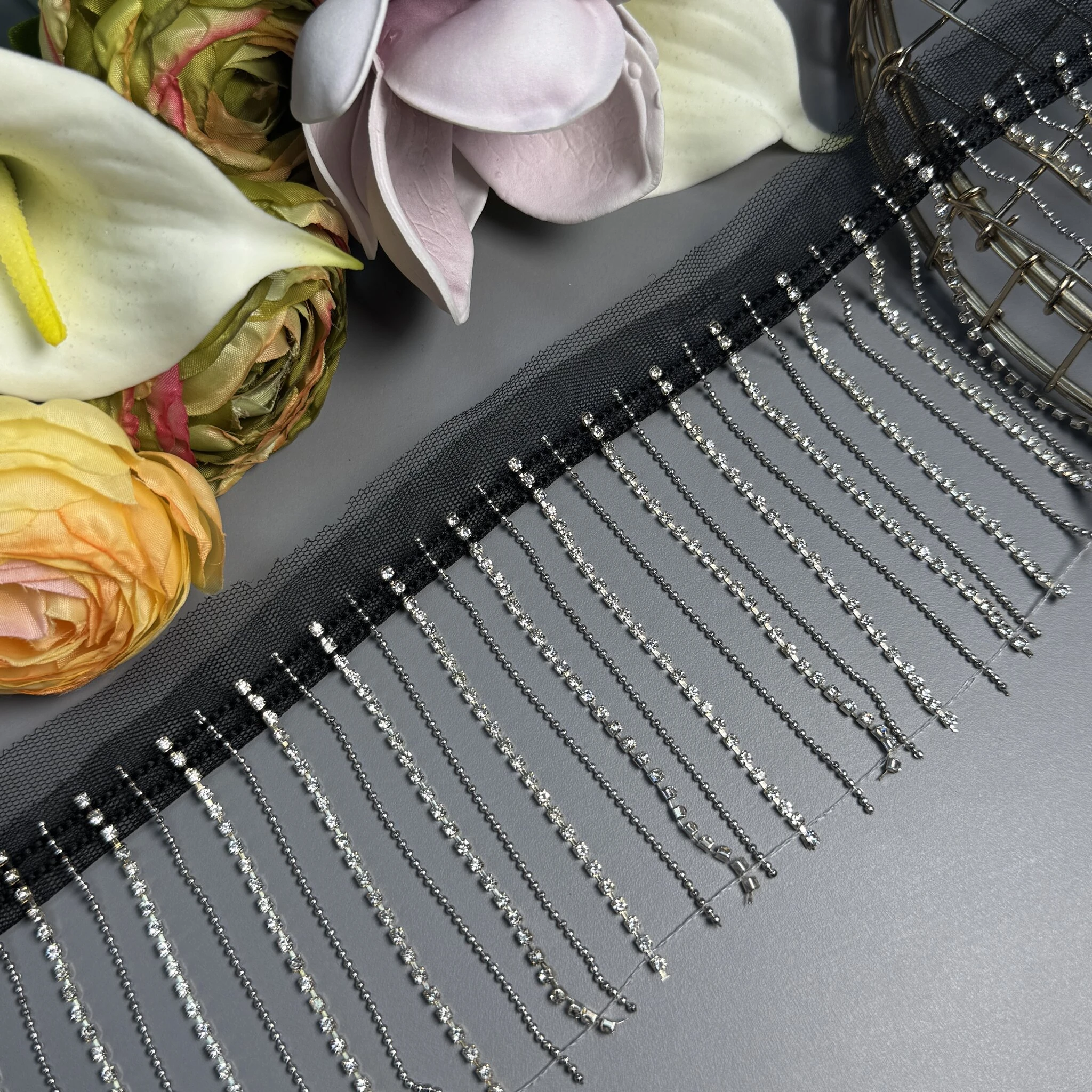 Бахрома з камінням та кульками 9 см (23 м), чорний підійде для пошиття одягу, декору, білизни, аксесуарів та творчих проєктів. Допоможемо з підбором суміжних позицій і кольорів.