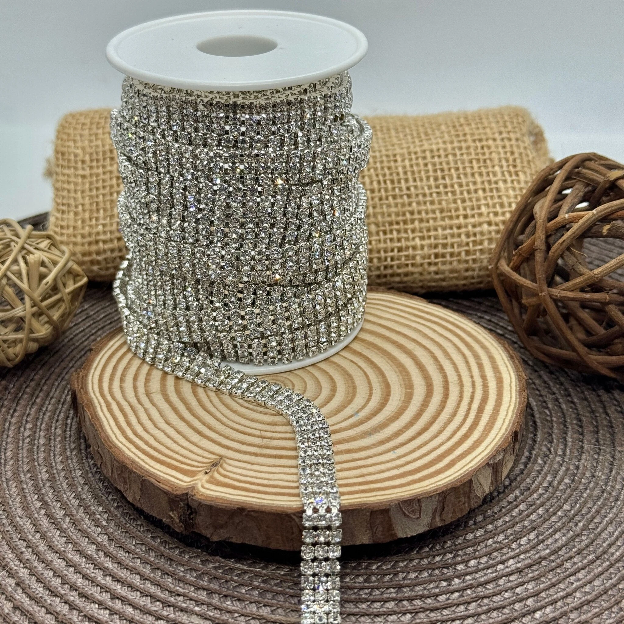 Цепи з каменями SS12, 3 ряди, 3 мм, 10 ярдів – декоративна металева стрічка з трьома рядами блискучих камінців діаметром 3 мм. Ідеально підходить для прикрашання одягу, аксесуарів та хендмейд виробів, створюючи яскравий і рівний блиск на будь-якій поверхні.