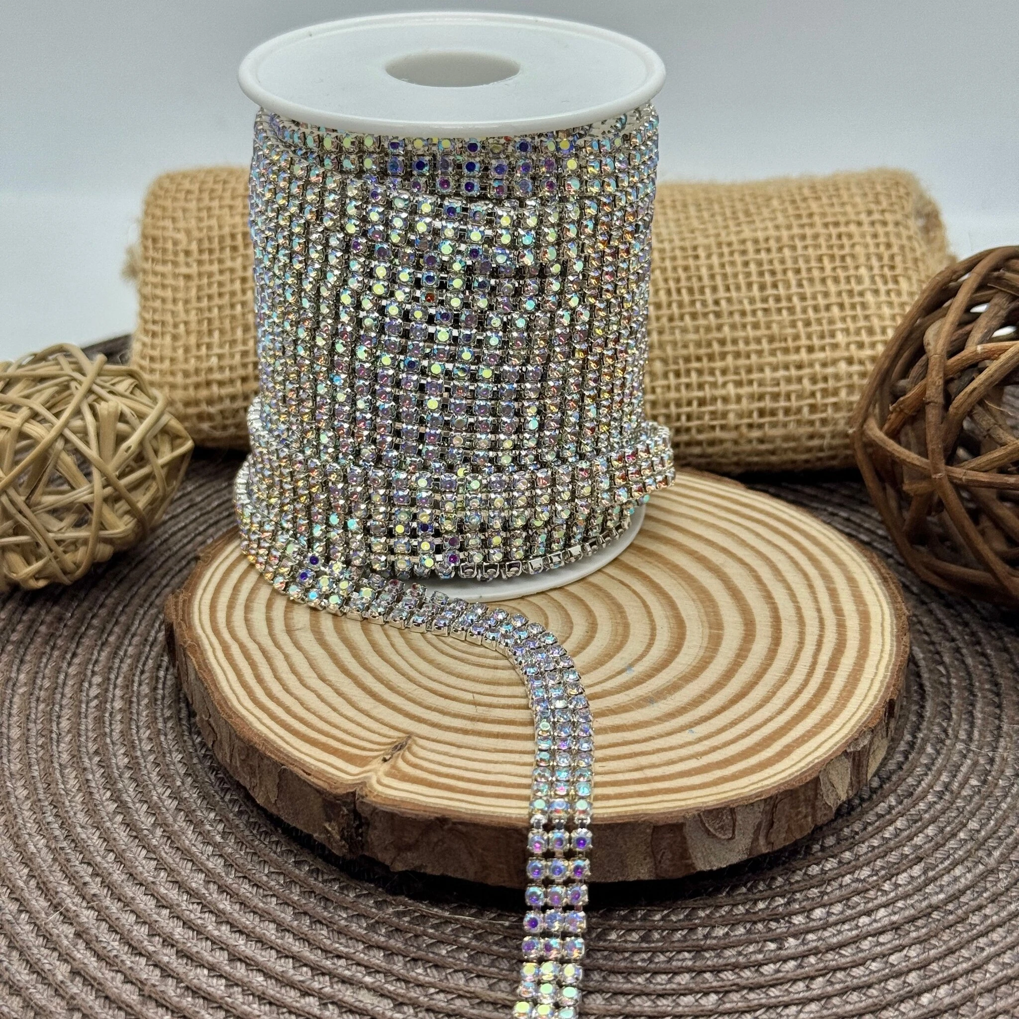 Цепи з каменями SS12, 3 ряди, 3 мм, 10 ярдів – декоративна металева стрічка з трьома рядами блискучих камінців діаметром 3 мм. Ідеально підходить для прикрашання одягу, аксесуарів та хендмейд виробів, створюючи яскравий і рівний блиск на будь-якій поверхні.