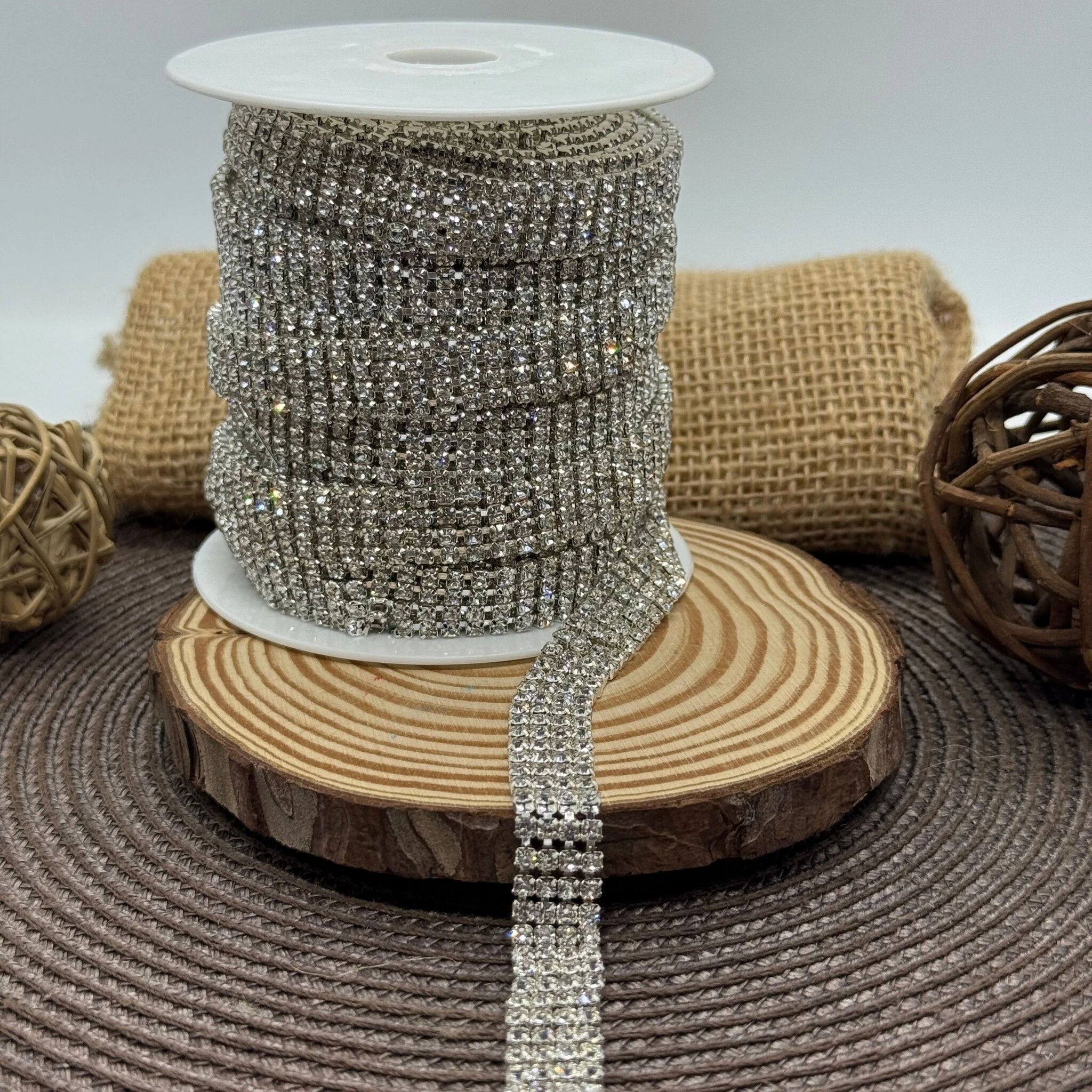 Цепи з каменями SS12, 4 ряди, 3 мм, 10 ярдів – декоративна металева стрічка з чотирма рядами блискучих камінців діаметром 3 мм. Ідеально підходить для прикрашання одягу, аксесуарів та хендмейд виробів, створюючи насичений блиск і виразний декоративний ефект.