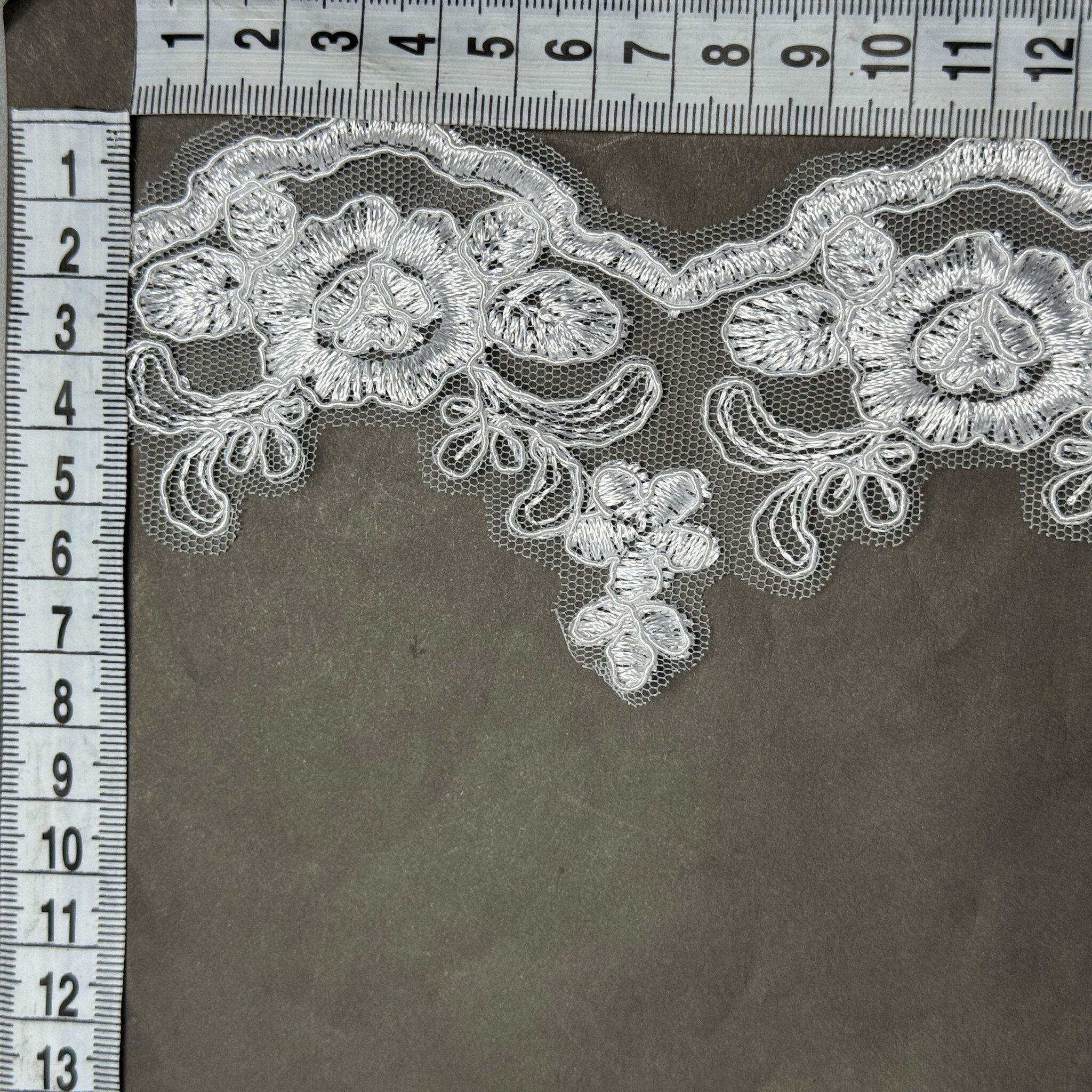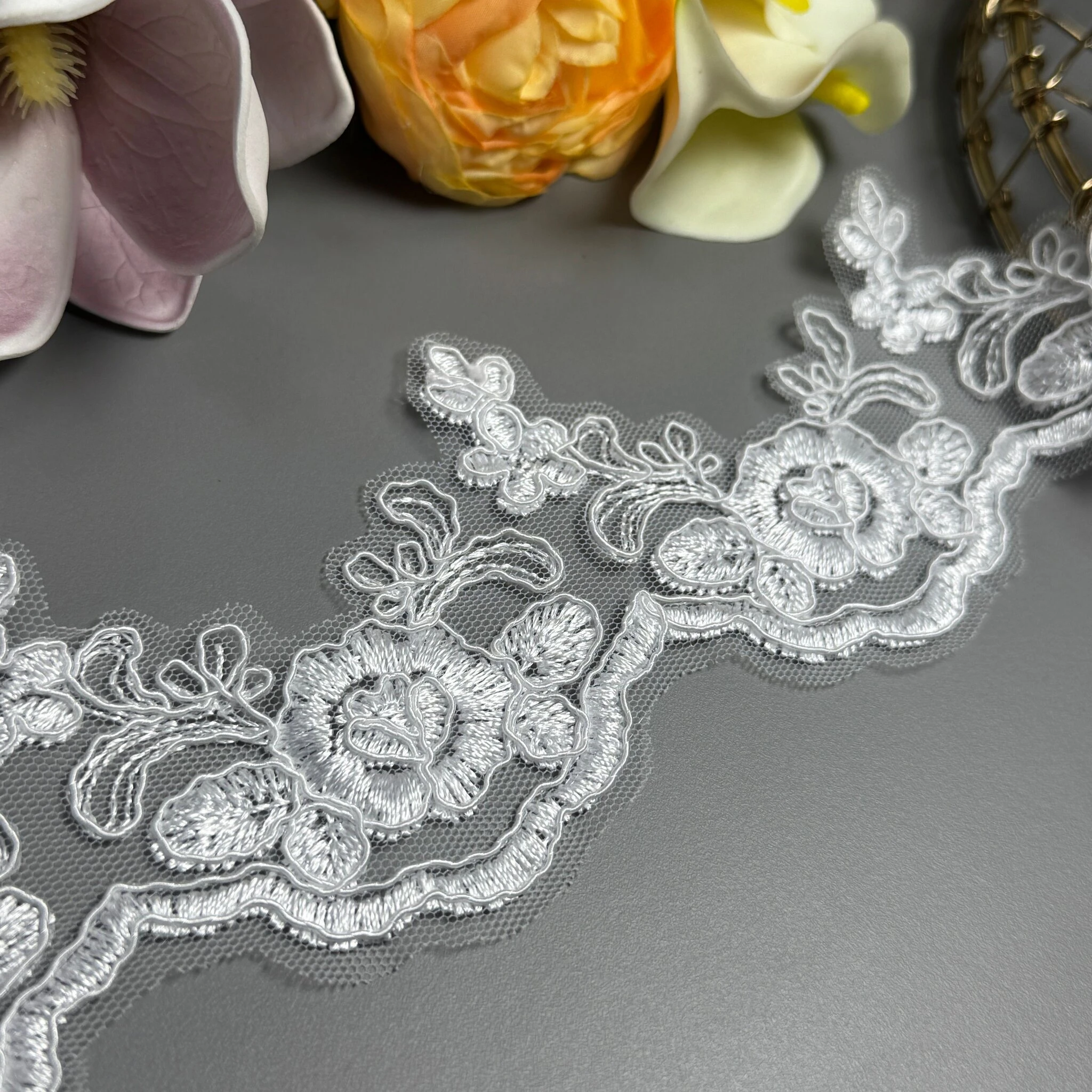 Мереживна кайма з кордом і паєтками - поєднує легкість сітчастої основи та виразність флористичного дизайну. Візерунок побудований на чергуванні великих квіткових гілок із меншими, що створює гармонійний ритм і глибину. Корд чітко окреслює контури квітів, підкреслюючи їхню форму та додаючи об’єму. Паєтки делікатно виблискують при русі.