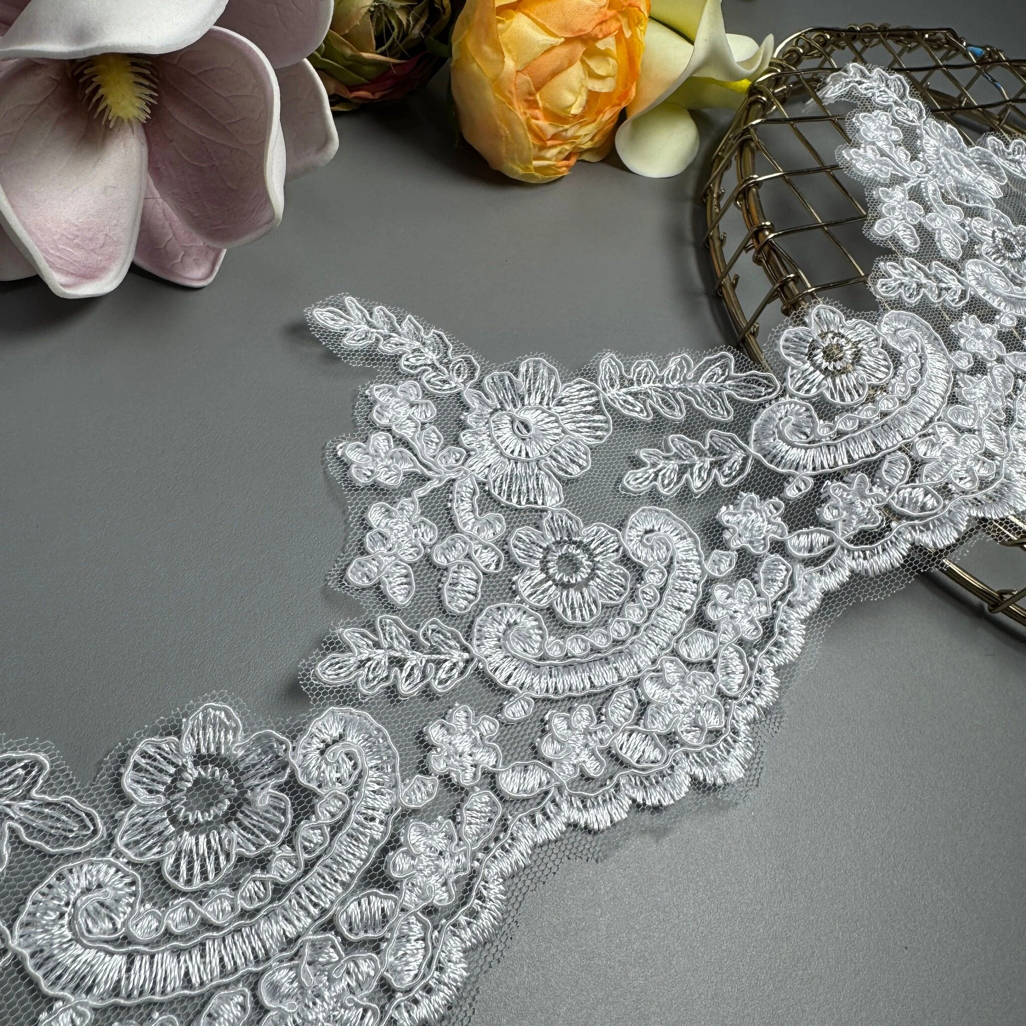 Мереживо з кордовою ниткою – це вишуканий матеріал, у якому ніжний візерунок додатково підкреслений тонкою рельєфною ниткою. Завдяки цьому мереживо виглядає більш об’ємним, фактурним та елегантним.