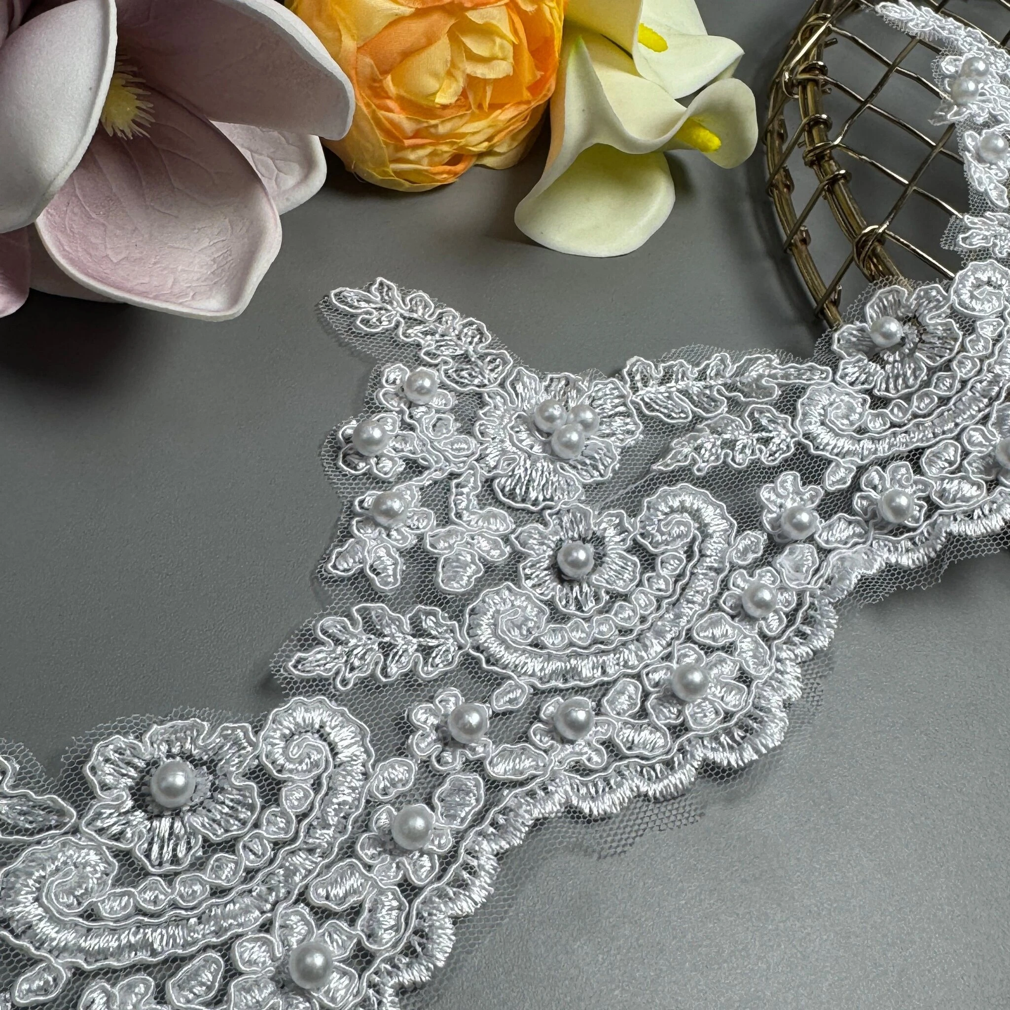 Мереживо з кордовою ниткою + Перлина– це вишуканий матеріал, у якому ніжний візерунок додатково підкреслений тонкою рельєфною ниткою. Завдяки цьому мереживо виглядає більш об’ємним, фактурним та елегантним.