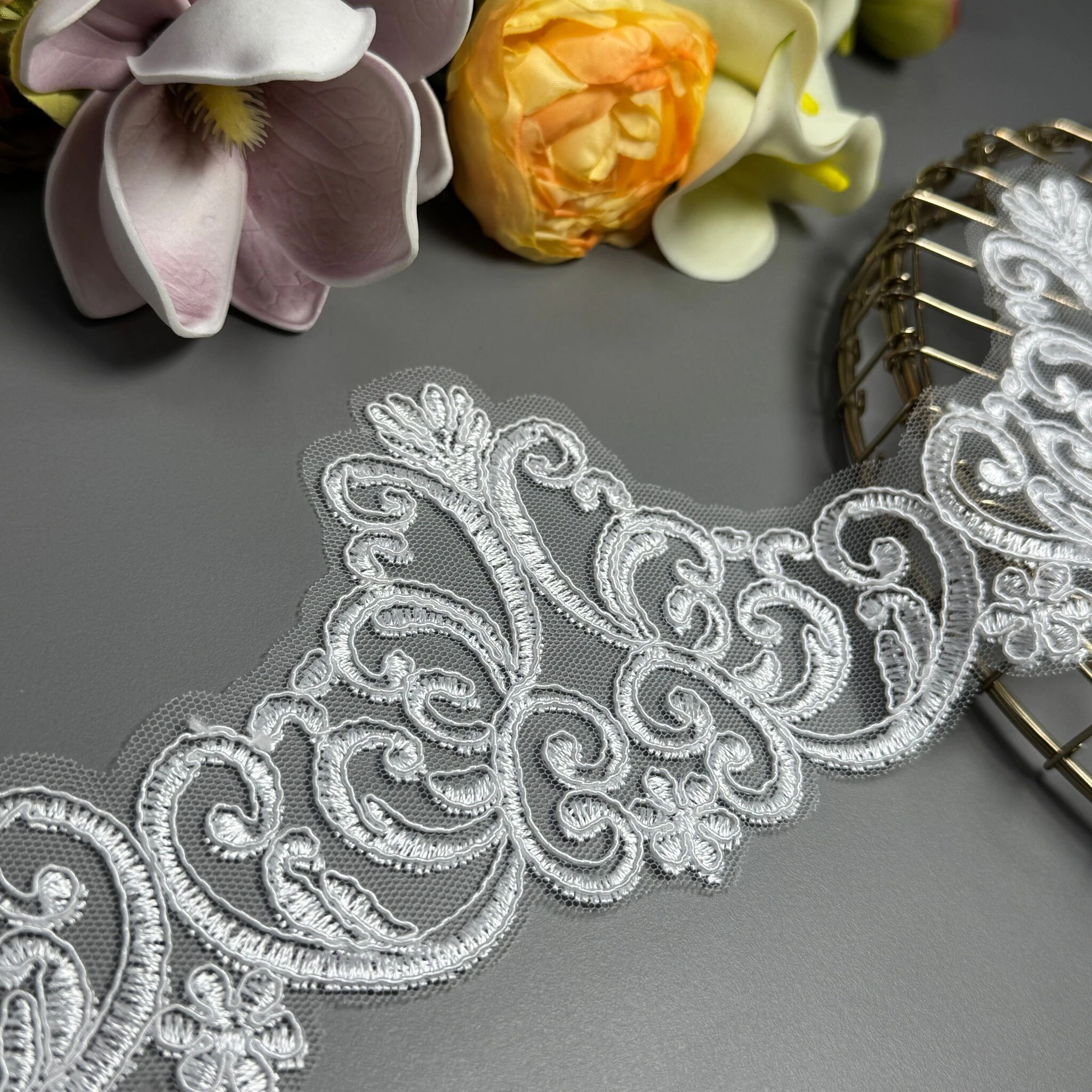 Мереживо з кордовою ниткою – це вишуканий матеріал, у якому ніжний візерунок додатково підкреслений тонкою рельєфною ниткою. Завдяки цьому мереживо виглядає більш об’ємним, фактурним та елегантним.