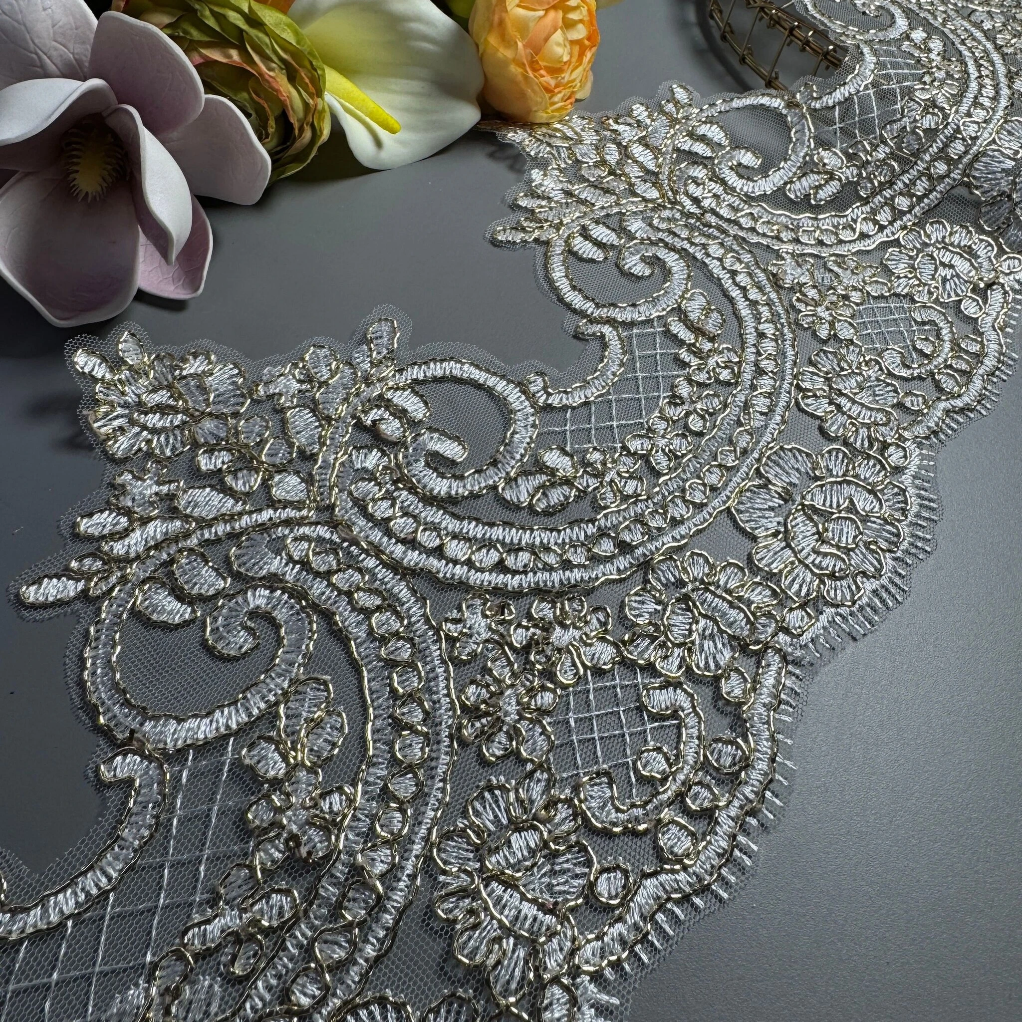 Мереживна кайма з кордом і люрексом  - поєднує легкість сітчастої основи та виразність флористичного дизайну. Візерунок побудований на чергуванні великих квіткових гілок із меншими, що створює гармонійний ритм і глибину. Корд чітко окреслює контури квітів, підкреслюючи їхню форму та додаючи об’єму. Люрекс делікатно виблискують при русі.