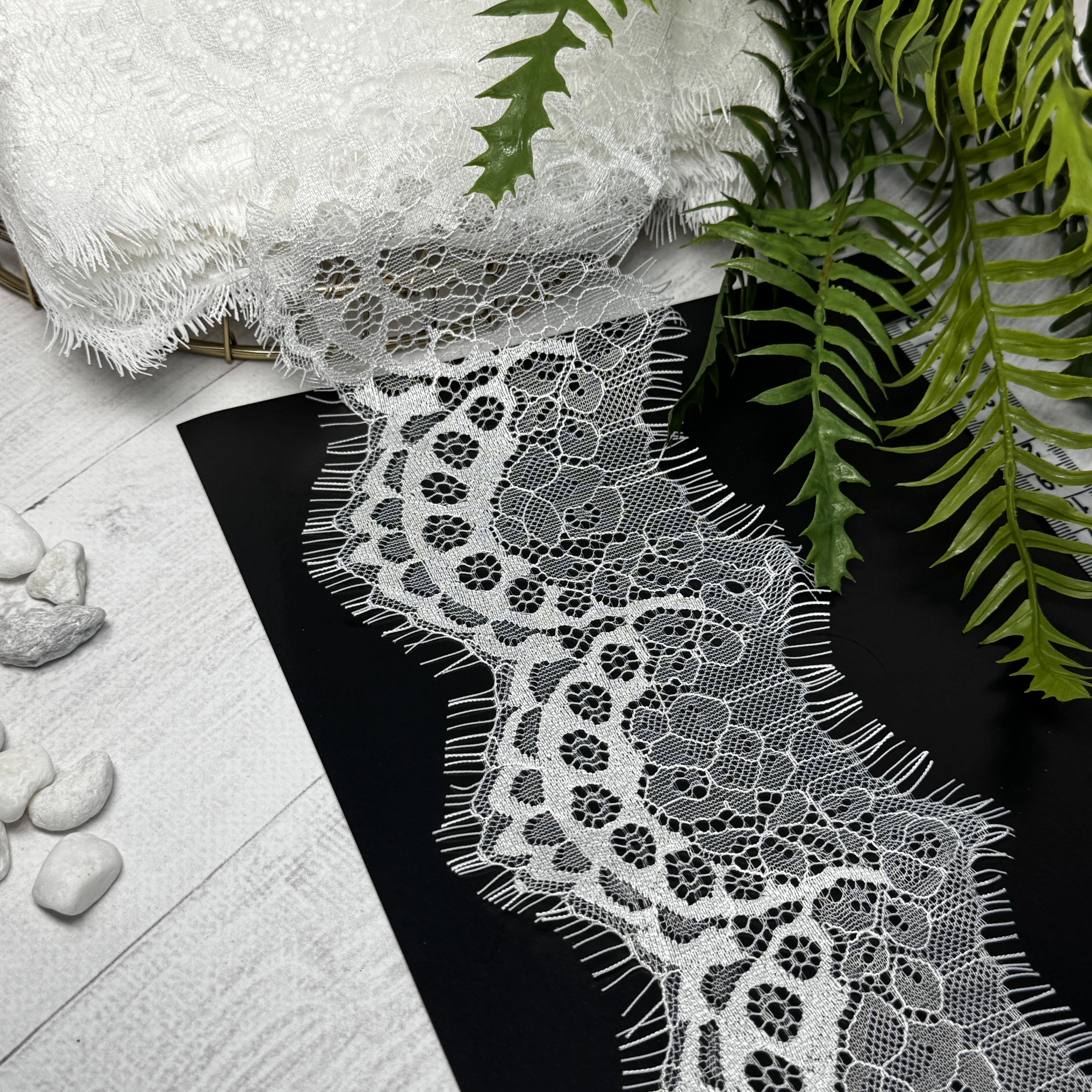 Французьке мереживо Шантильї — символ витонченості та елегантності. Легке, тонке й повітряне мереживо з вишуканим квітковим візерунком ідеально підходить для весільних та вечірніх суконь, блуз, білизни та декоративного оздоблення. Додає виробам розкішного та благородного вигляду.