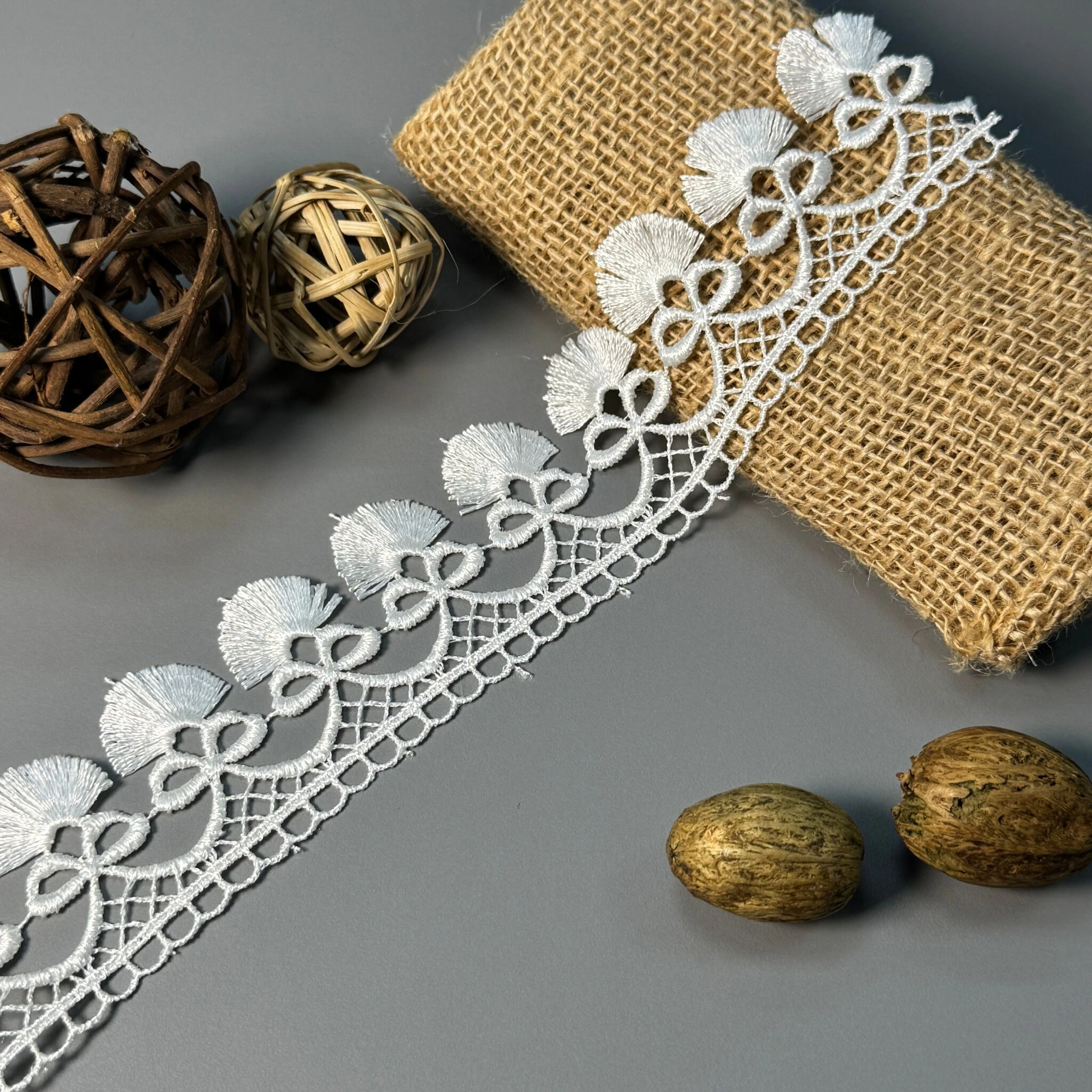 Мереживо поліестер – декоративний матеріал з синтетичного волокна, що відзначається високою зносостійкістю та стабільністю форми. Поліестер не схильний до деформацій, не розтягується і не мнеться, що робить мереживо придатним для частого використання.