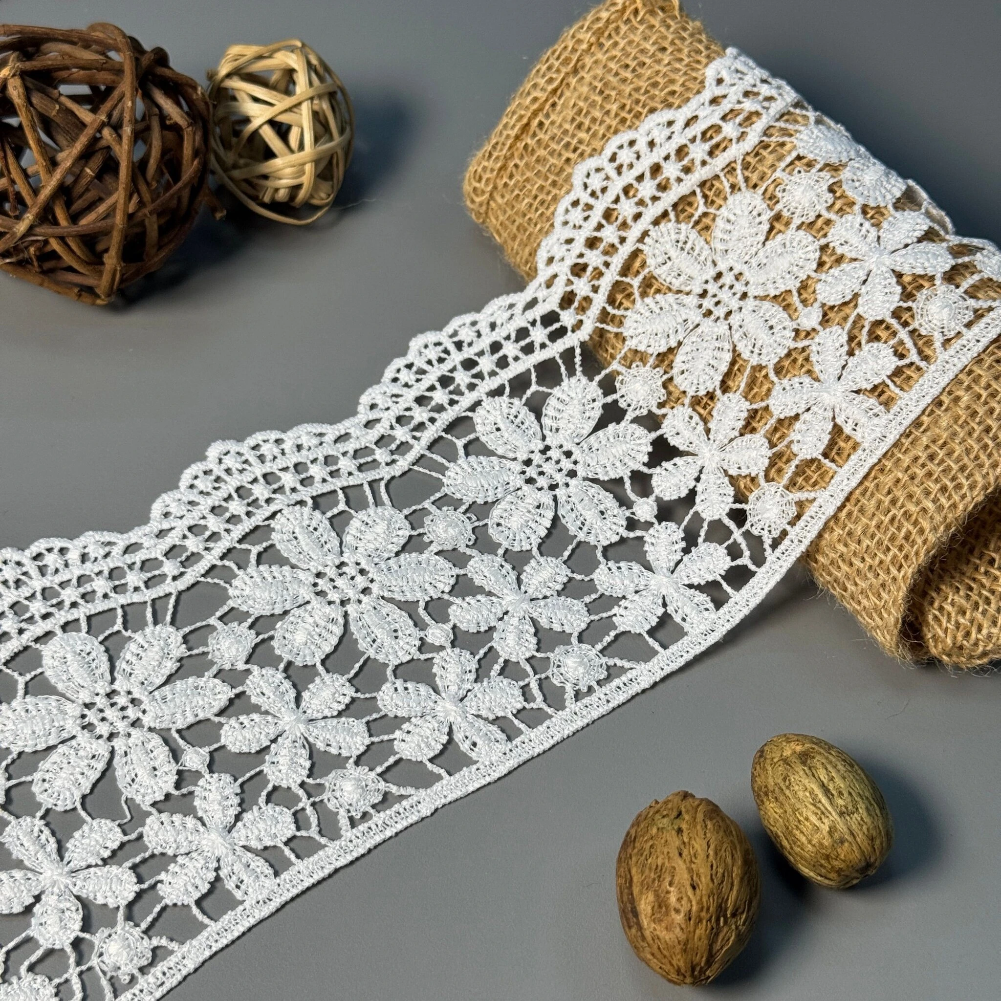 Мереживо поліестер – декоративний матеріал з синтетичного волокна, що відзначається високою зносостійкістю та стабільністю форми. Поліестер не схильний до деформацій, не розтягується і не мнеться, що робить мереживо придатним для частого використання.