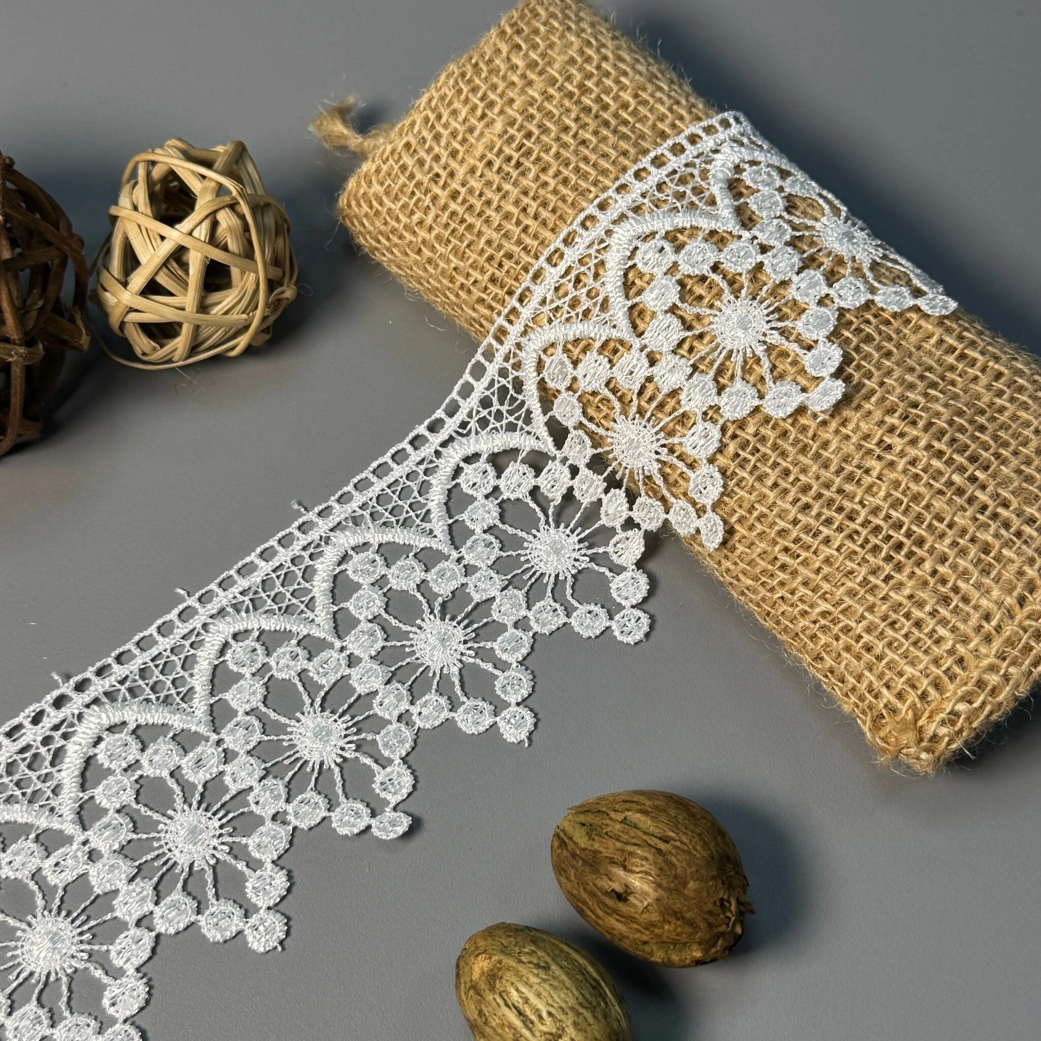 Мереживо поліестер – декоративний матеріал з синтетичного волокна, що відзначається високою зносостійкістю та стабільністю форми. Поліестер не схильний до деформацій, не розтягується і не мнеться, що робить мереживо придатним для частого використання.