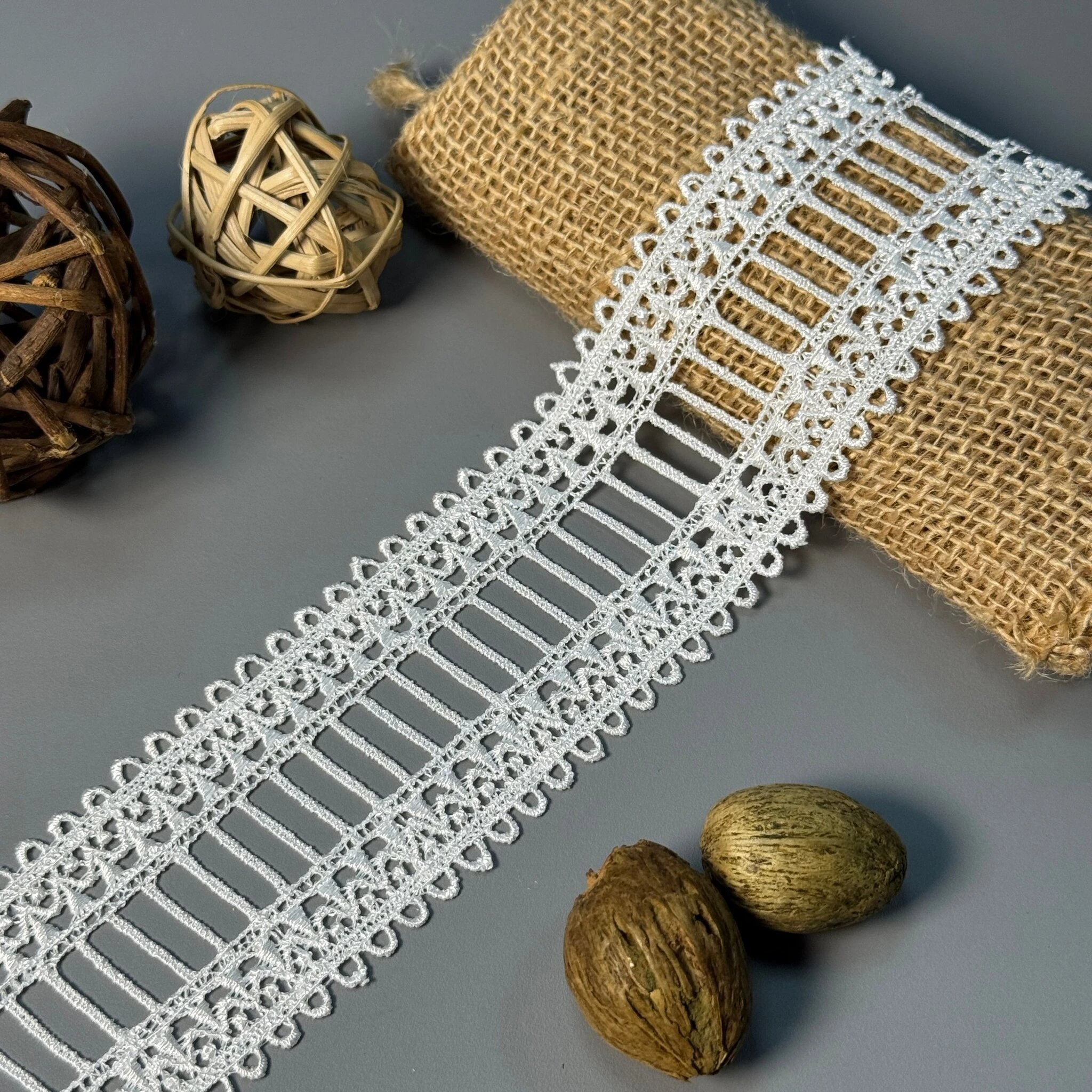 Мереживо поліестер – декоративний матеріал з синтетичного волокна, що відзначається високою зносостійкістю та стабільністю форми. Поліестер не схильний до деформацій, не розтягується і не мнеться, що робить мереживо придатним для частого використання.