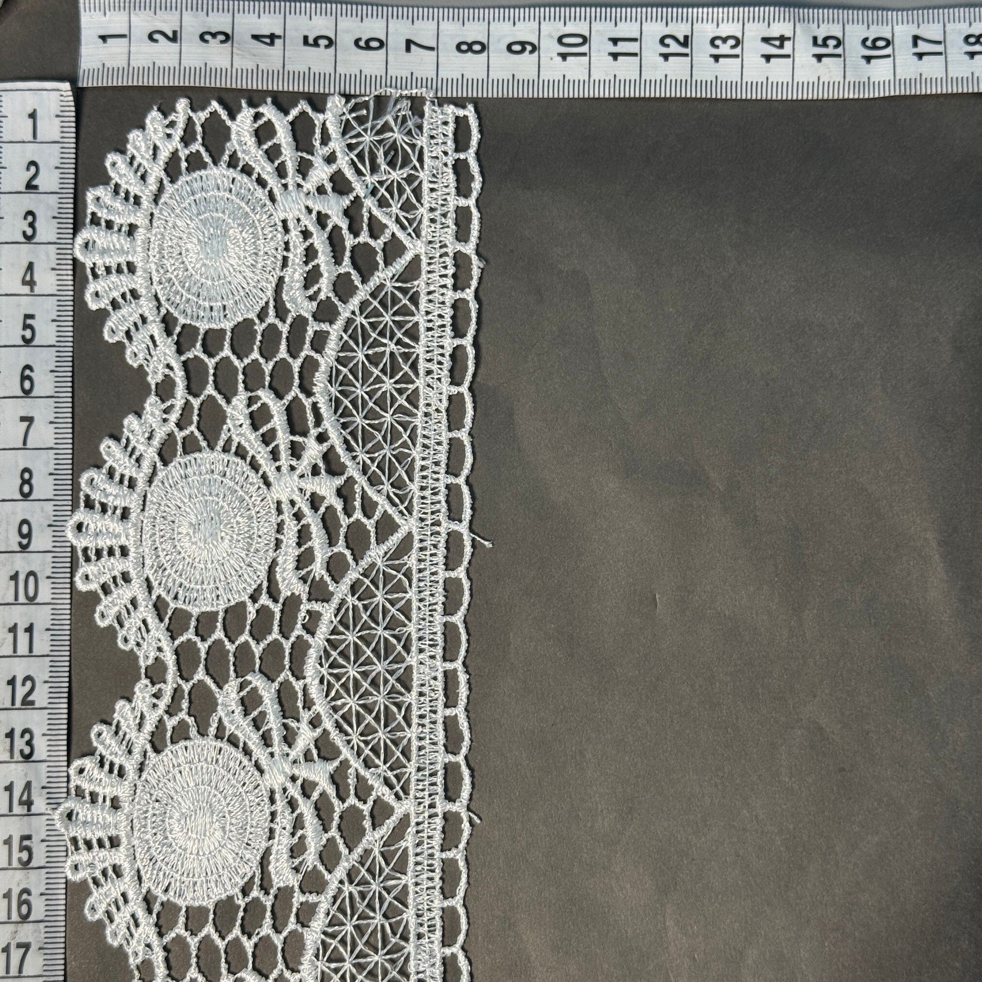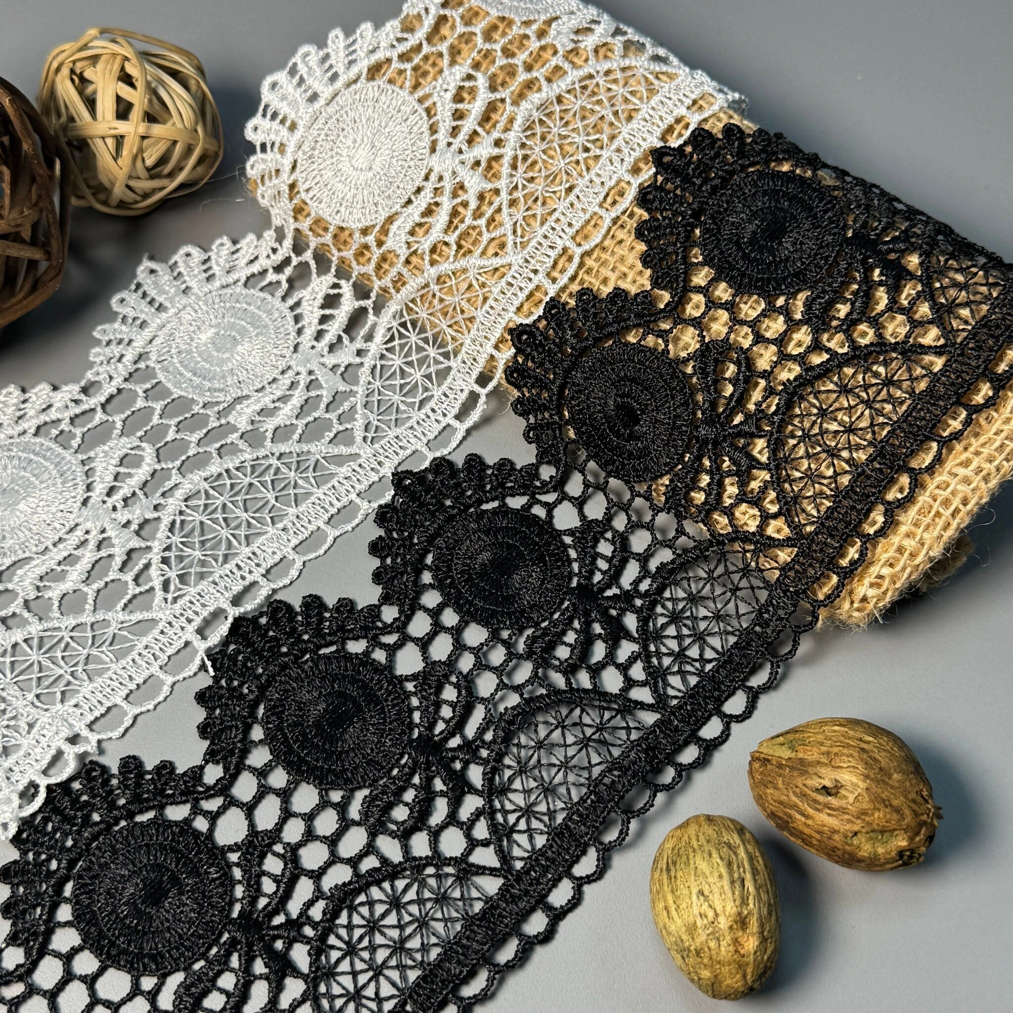 Мереживо поліестер – декоративний матеріал з синтетичного волокна, що відзначається високою зносостійкістю та стабільністю форми. Поліестер не схильний до деформацій, не розтягується і не мнеться, що робить мереживо придатним для частого використання.