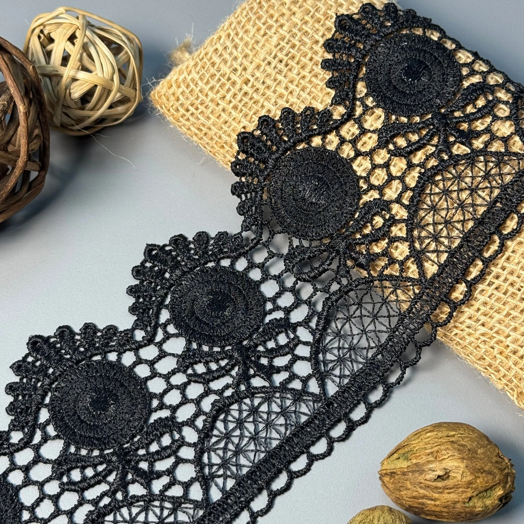 Мереживо поліестер – декоративний матеріал з синтетичного волокна, що відзначається високою зносостійкістю та стабільністю форми. Поліестер не схильний до деформацій, не розтягується і не мнеться, що робить мереживо придатним для частого використання.