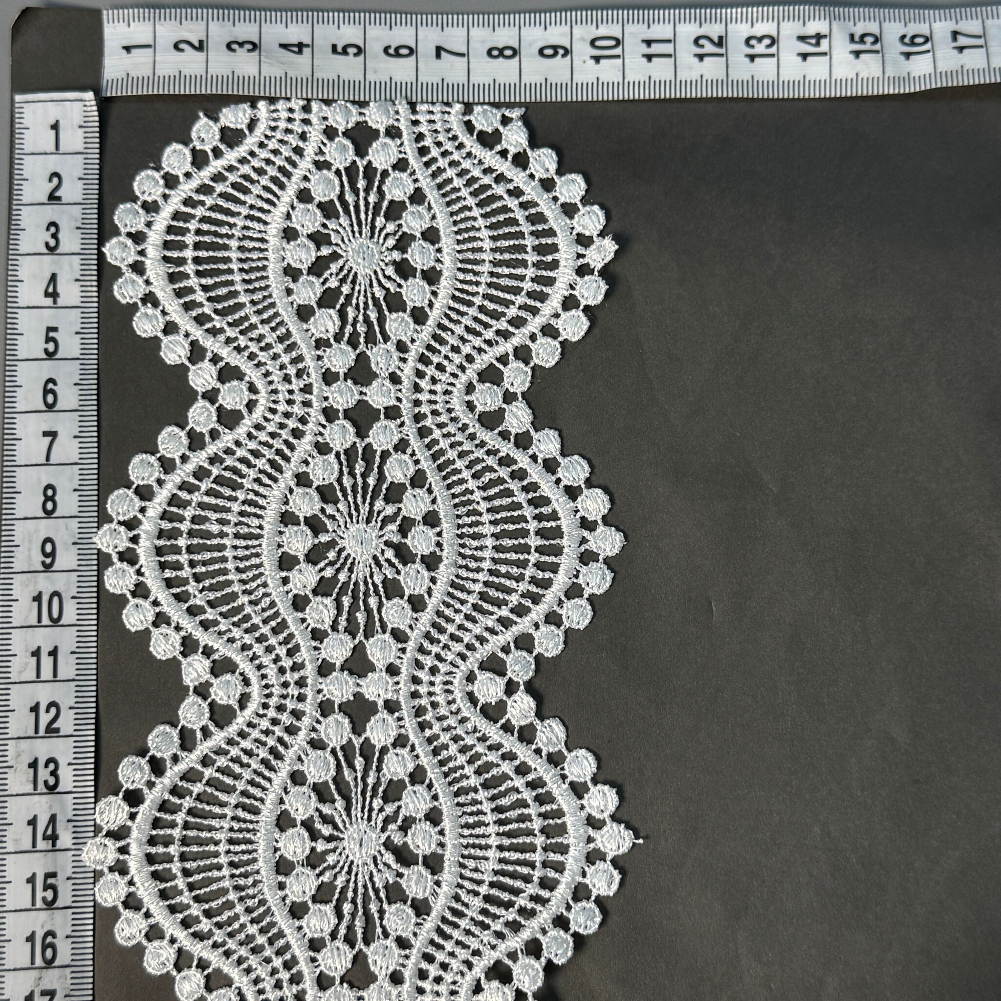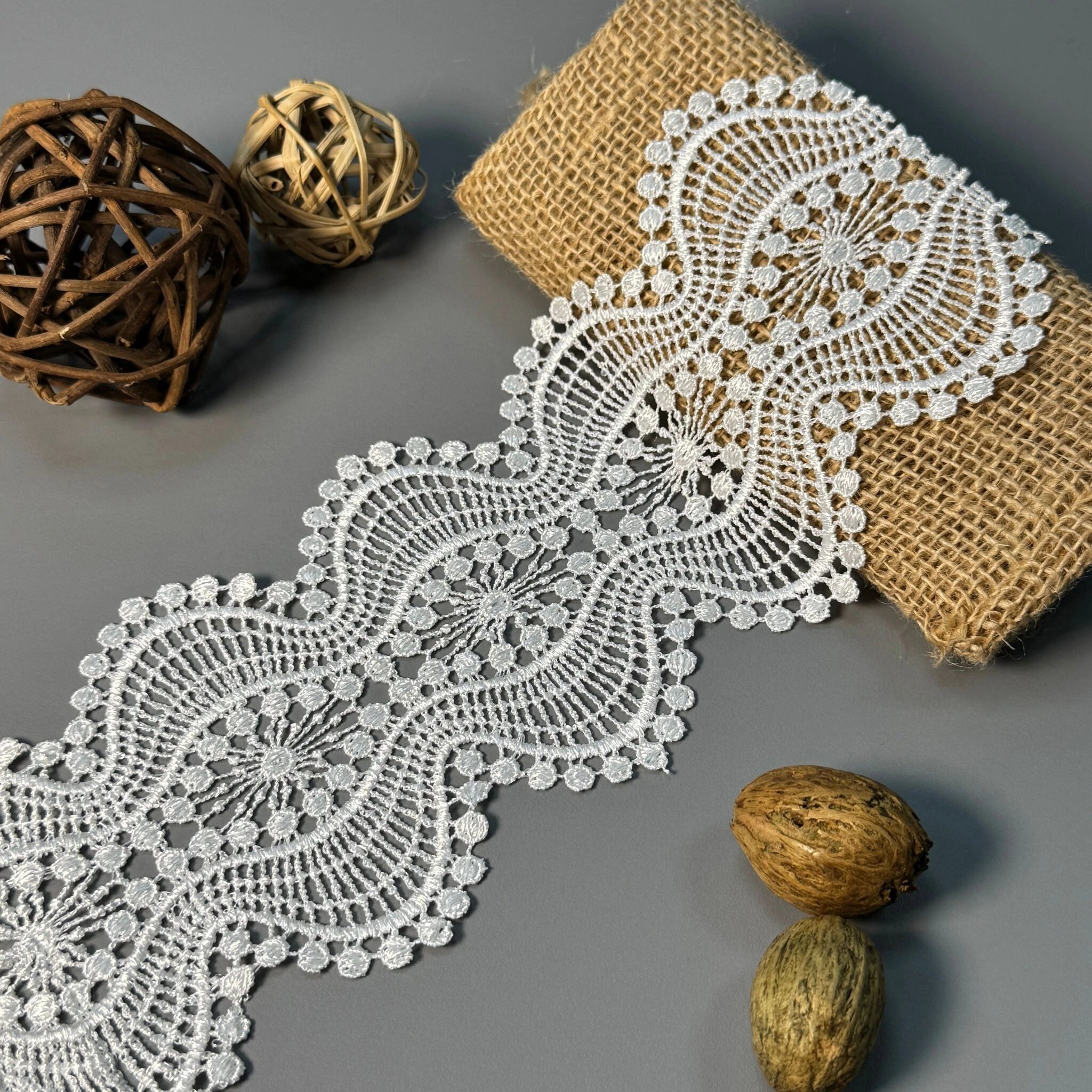 Мереживо поліестер – декоративний матеріал з синтетичного волокна, що відзначається високою зносостійкістю та стабільністю форми. Поліестер не схильний до деформацій, не розтягується і не мнеться, що робить мереживо придатним для частого використання.