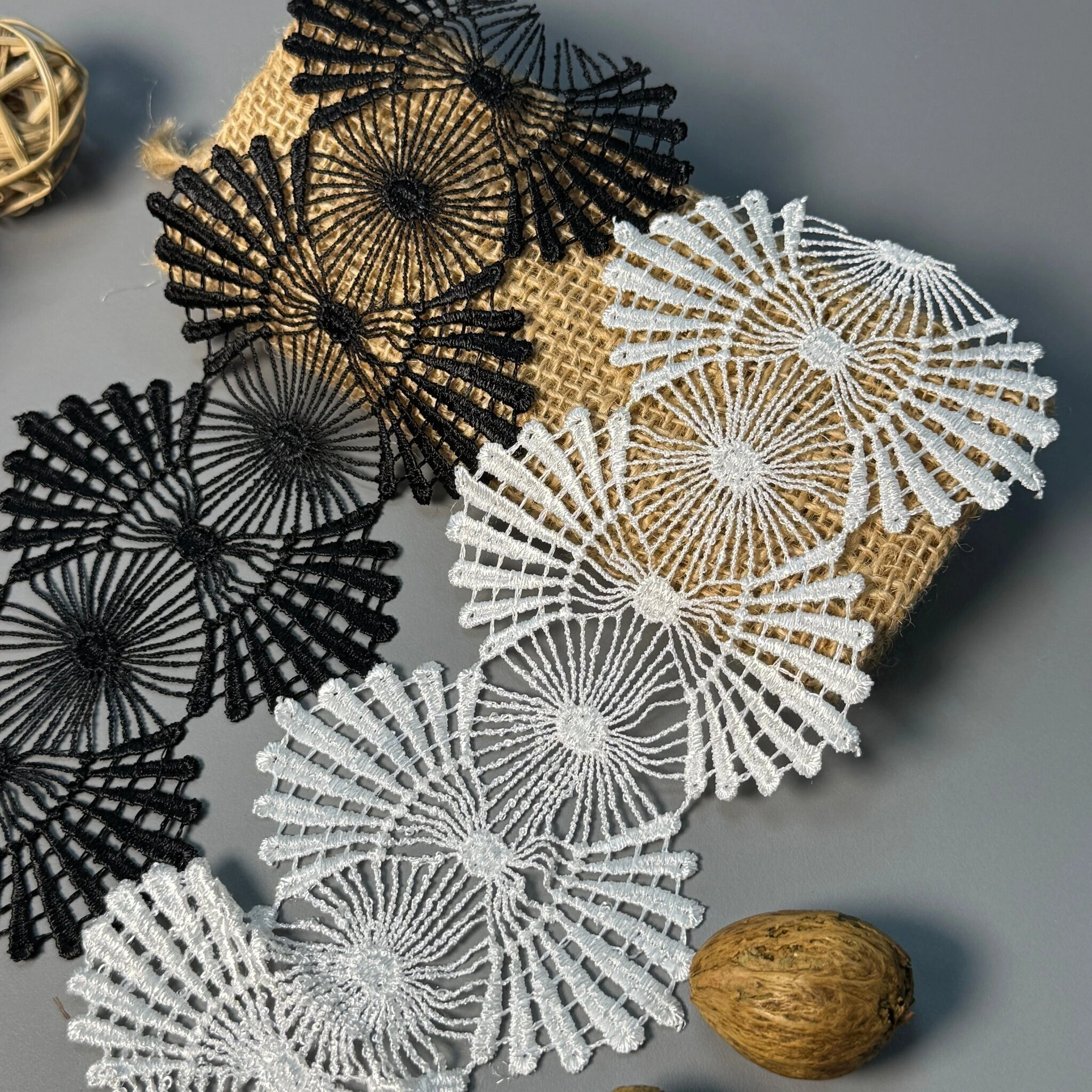 Мереживо поліестер – декоративний матеріал з синтетичного волокна, що відзначається високою зносостійкістю та стабільністю форми. Поліестер не схильний до деформацій, не розтягується і не мнеться, що робить мереживо придатним для частого використання.