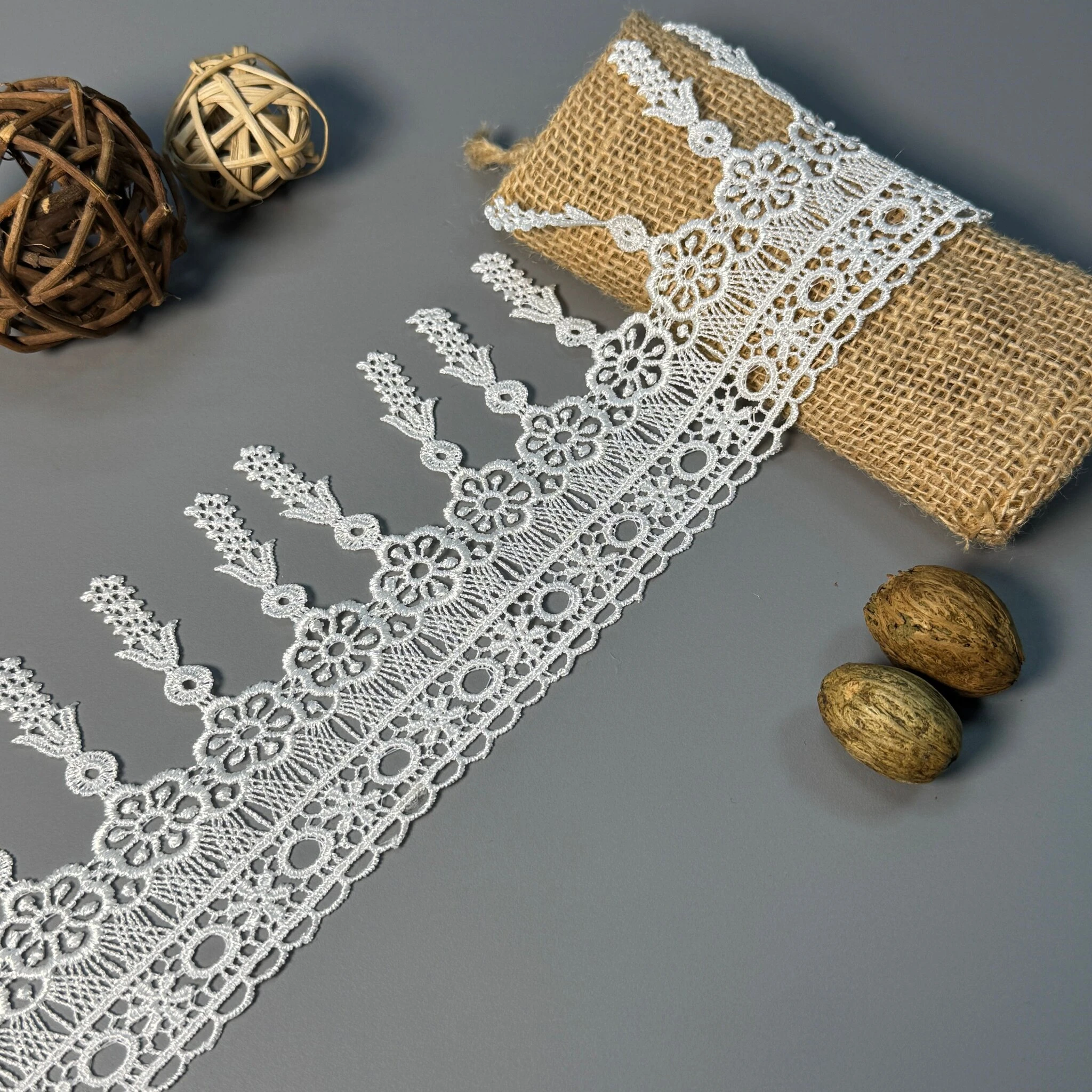 Мереживо поліестер – декоративний матеріал з синтетичного волокна, що відзначається високою зносостійкістю та стабільністю форми. Поліестер не схильний до деформацій, не розтягується і не мнеться, що робить мереживо придатним для частого використання.