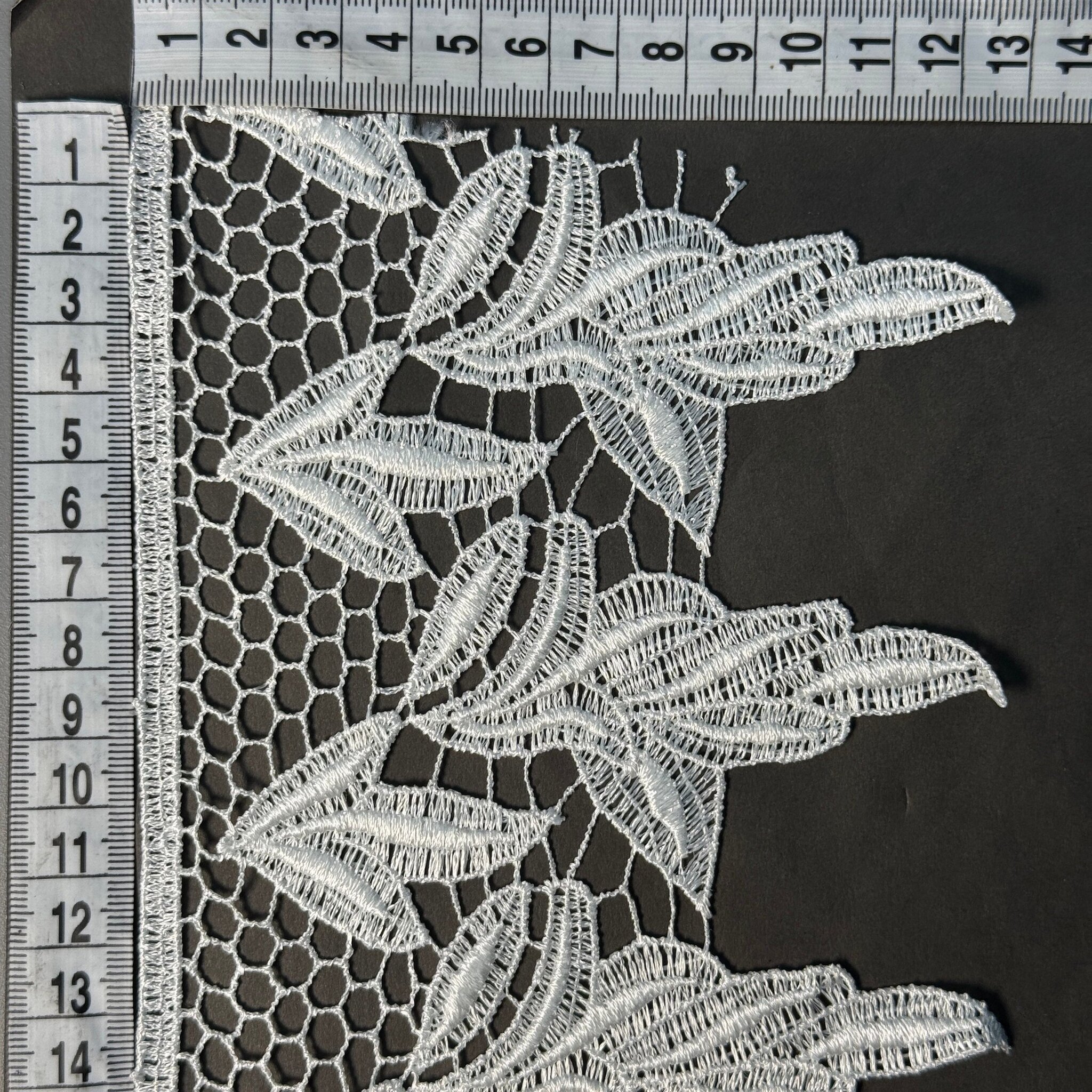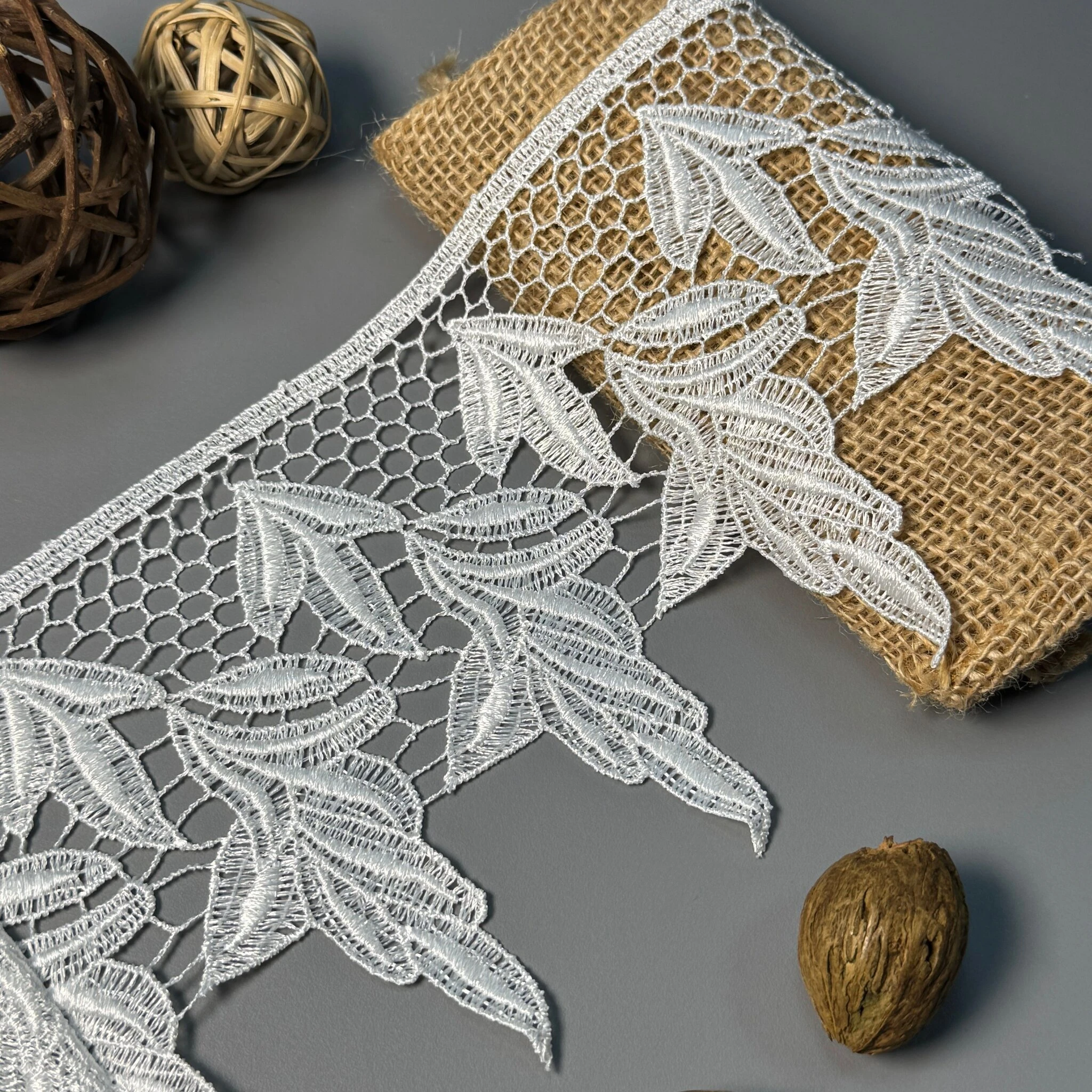 Мереживо поліестер – декоративний матеріал з синтетичного волокна, що відзначається високою зносостійкістю та стабільністю форми. Поліестер не схильний до деформацій, не розтягується і не мнеться, що робить мереживо придатним для частого використання.