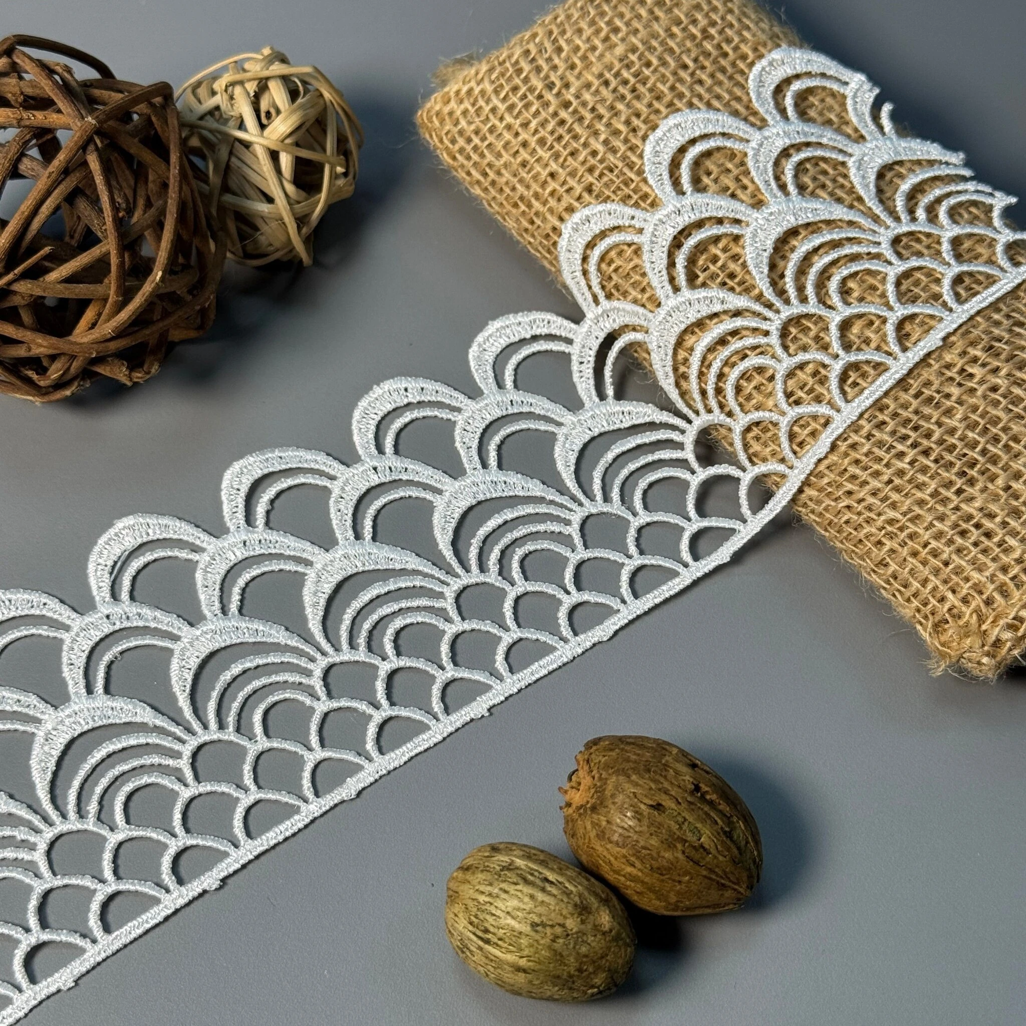 Мереживо поліестер – декоративний матеріал з синтетичного волокна, що відзначається високою зносостійкістю та стабільністю форми. Поліестер не схильний до деформацій, не розтягується і не мнеться, що робить мереживо придатним для частого використання.