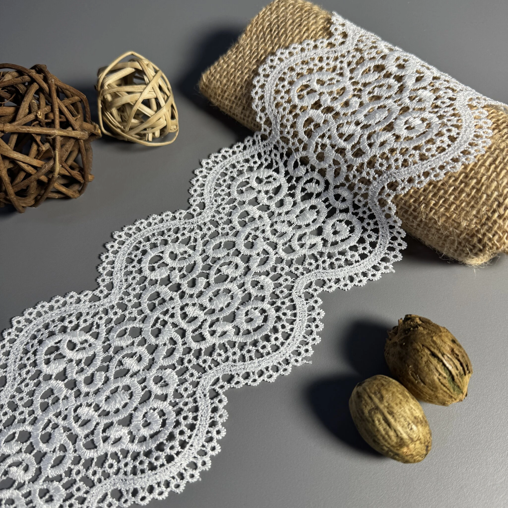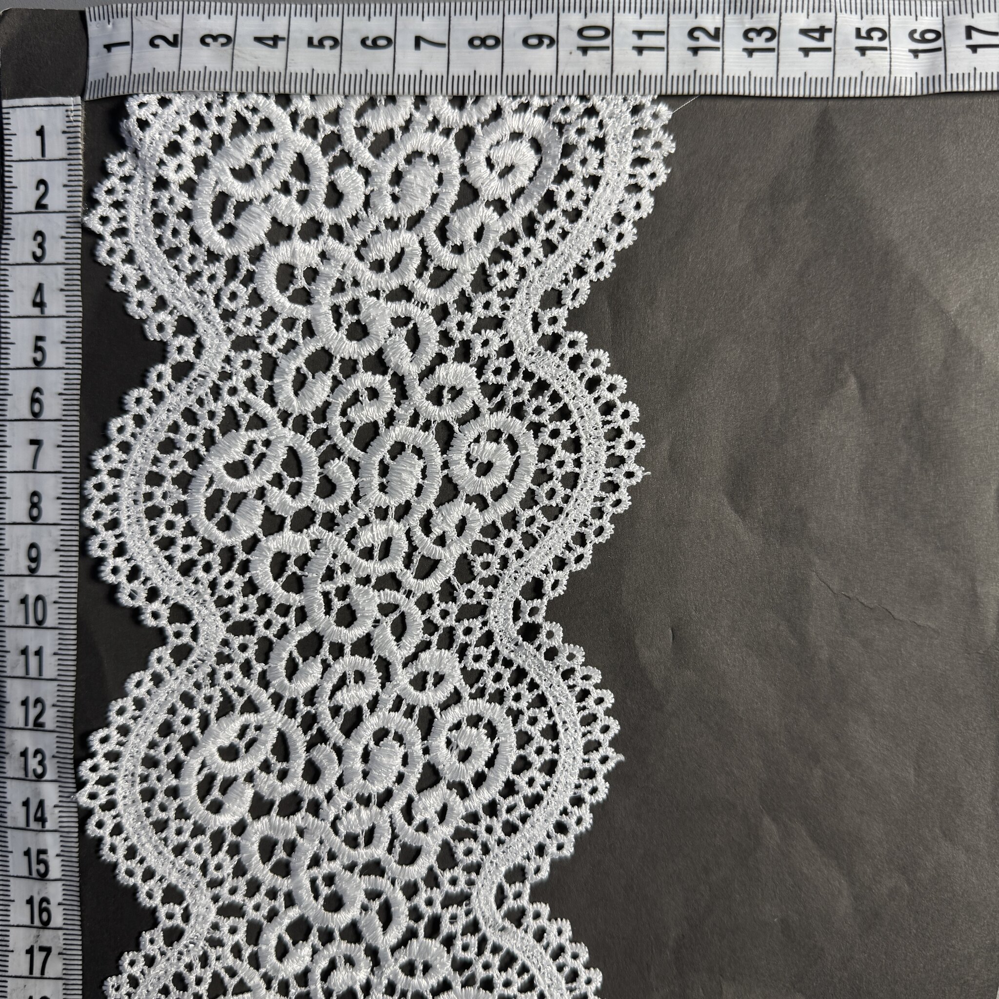 Мереживо поліестер – декоративний матеріал з синтетичного волокна, що відзначається високою зносостійкістю та стабільністю форми. Поліестер не схильний до деформацій, не розтягується і не мнеться, що робить мереживо придатним для частого використання.