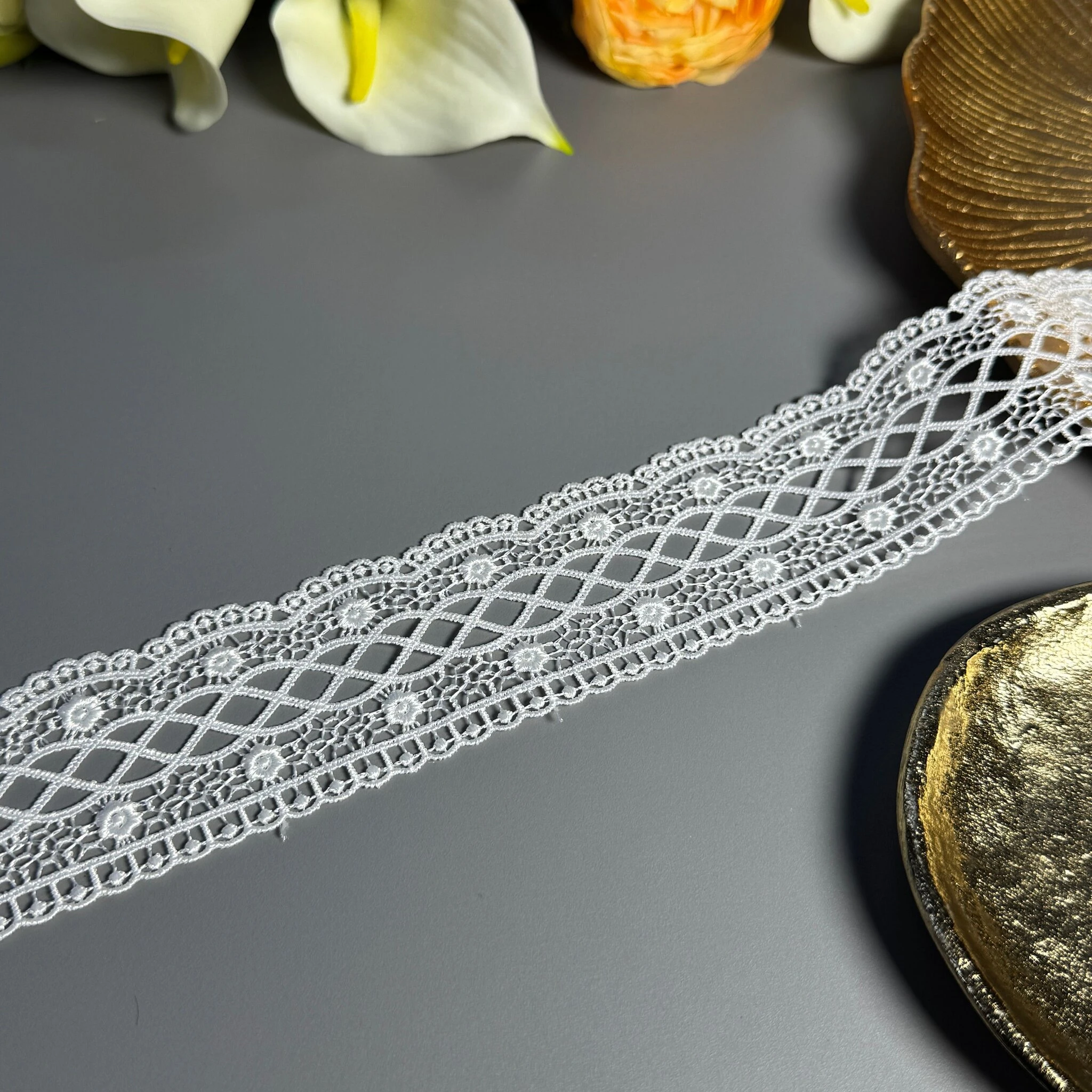 Мереживо поліестер – декоративний матеріал з синтетичного волокна, що відзначається високою зносостійкістю та стабільністю форми. Поліестер не схильний до деформацій, не розтягується і не мнеться, що робить мереживо придатним для частого використання.