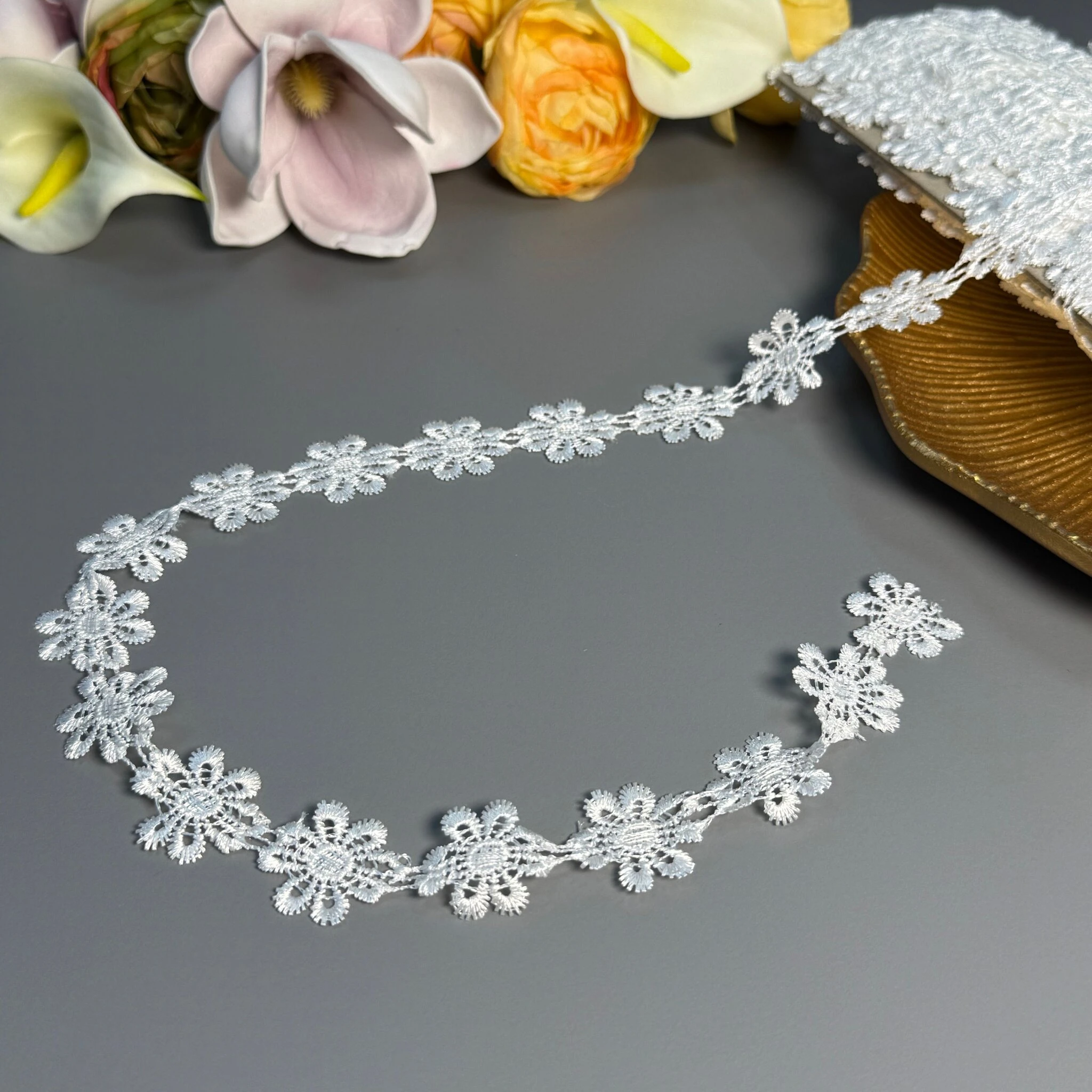 Мереживо поліестер – декоративний матеріал з синтетичного волокна, що відзначається високою зносостійкістю та стабільністю форми. Поліестер не схильний до деформацій, не розтягується і не мнеться, що робить мереживо придатним для частого використання.