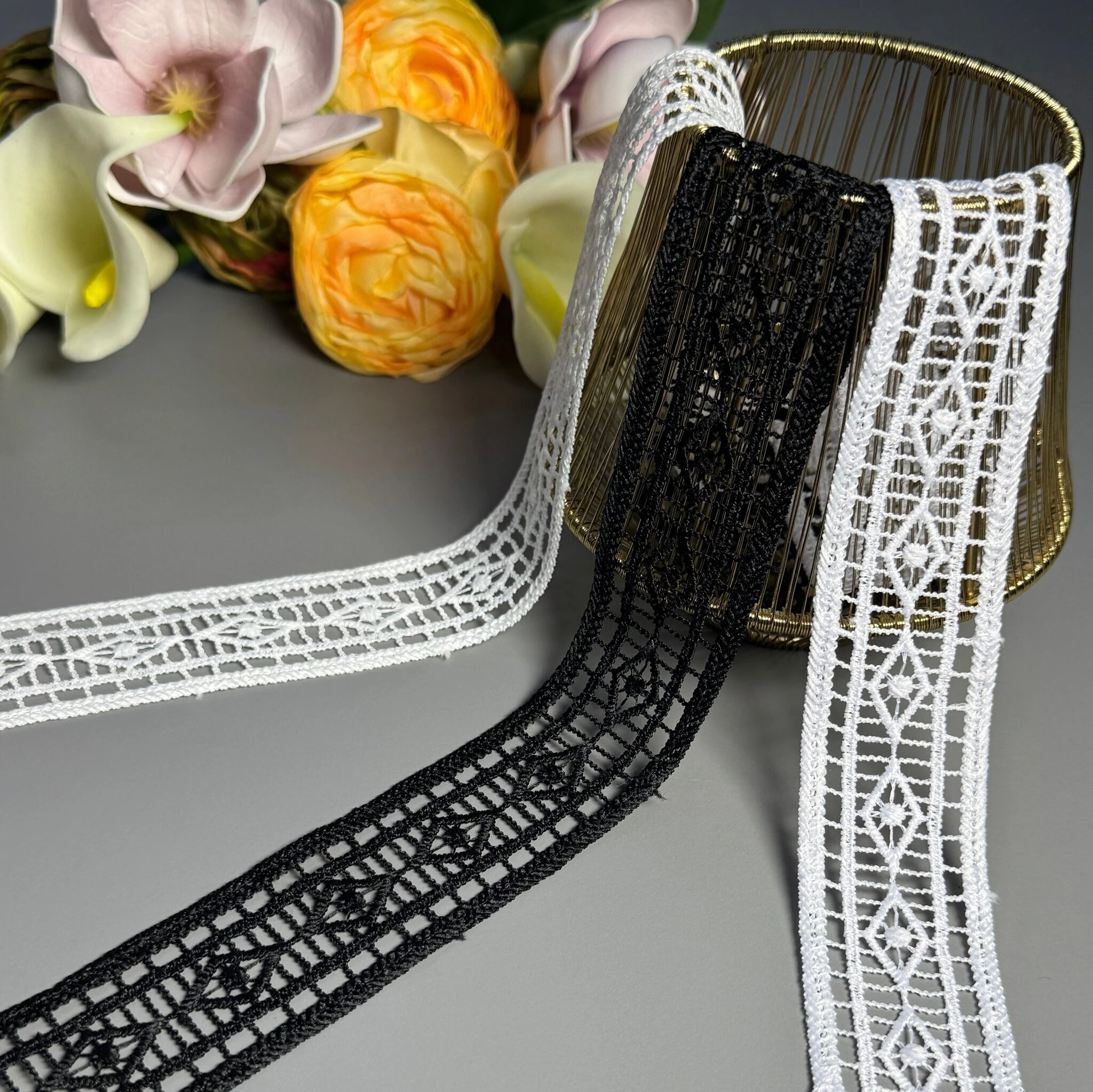 Мереживо поліестер – декоративний матеріал з синтетичного волокна, що відзначається високою зносостійкістю та стабільністю форми. Поліестер не схильний до деформацій, не розтягується і не мнеться, що робить мереживо придатним для частого використання.