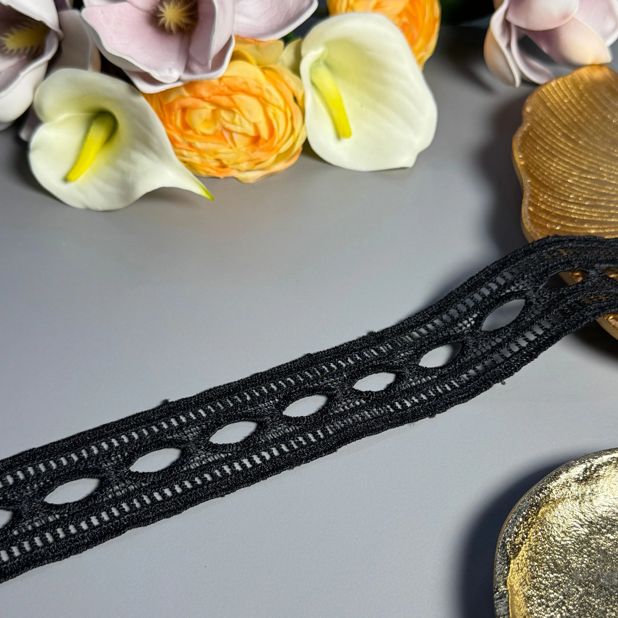 Мереживо поліестер – декоративний матеріал з синтетичного волокна, що відзначається високою зносостійкістю та стабільністю форми. Поліестер не схильний до деформацій, не розтягується і не мнеться, що робить мереживо придатним для частого використання.