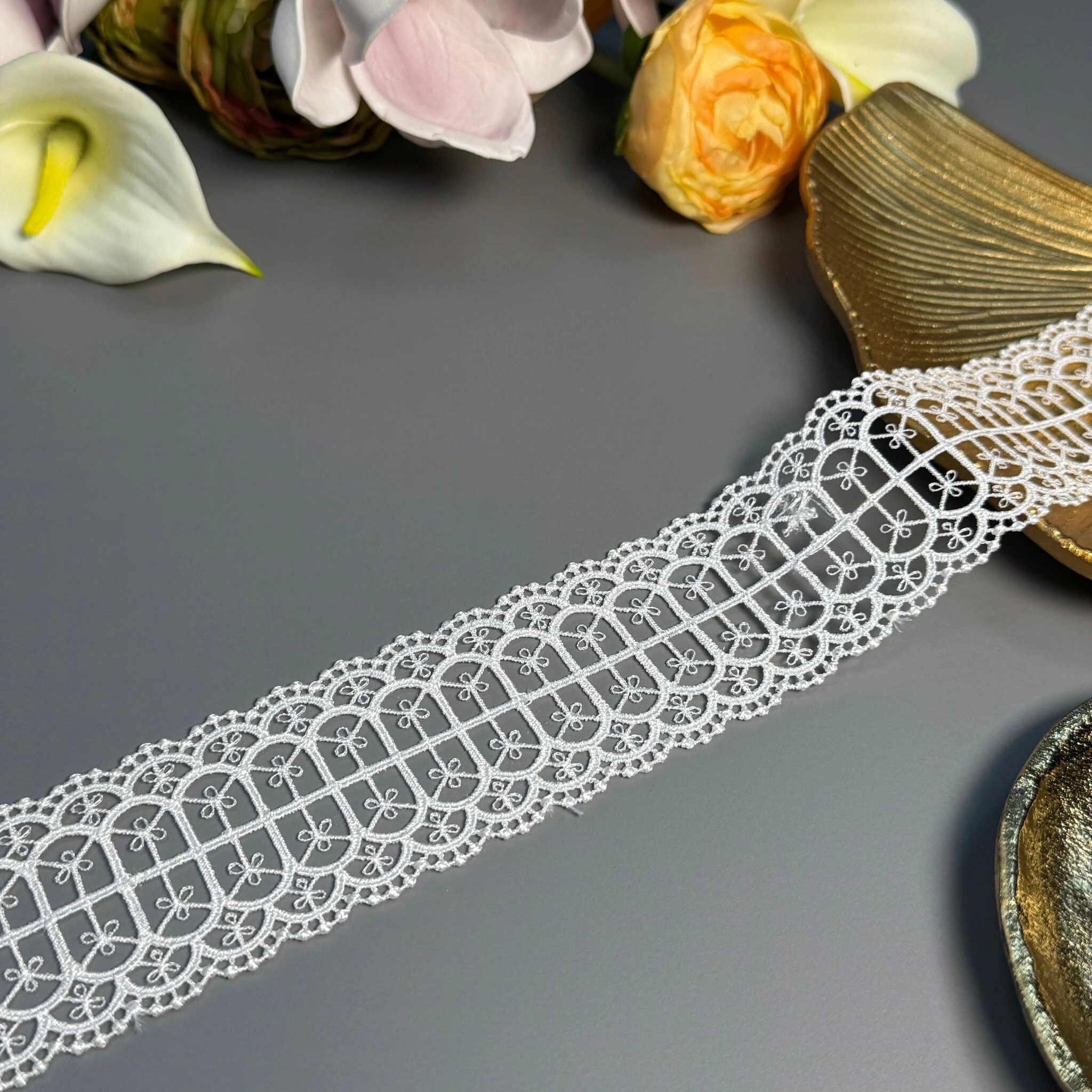 Мереживо поліестер – декоративний матеріал з синтетичного волокна, що відзначається високою зносостійкістю та стабільністю форми. Поліестер не схильний до деформацій, не розтягується і не мнеться, що робить мереживо придатним для частого використання.