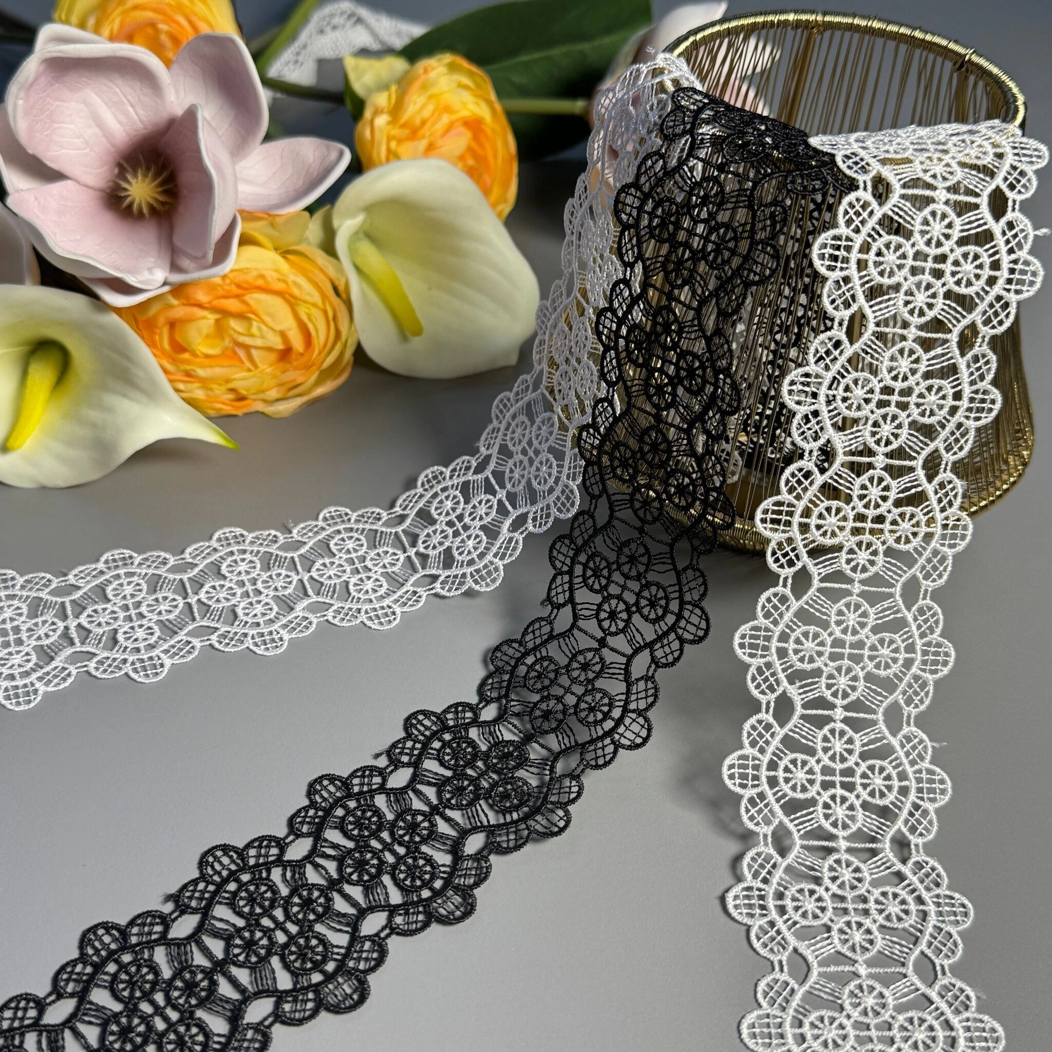 Мереживо поліестер – декоративний матеріал з синтетичного волокна, що відзначається високою зносостійкістю та стабільністю форми. Поліестер не схильний до деформацій, не розтягується і не мнеться, що робить мереживо придатним для частого використання.