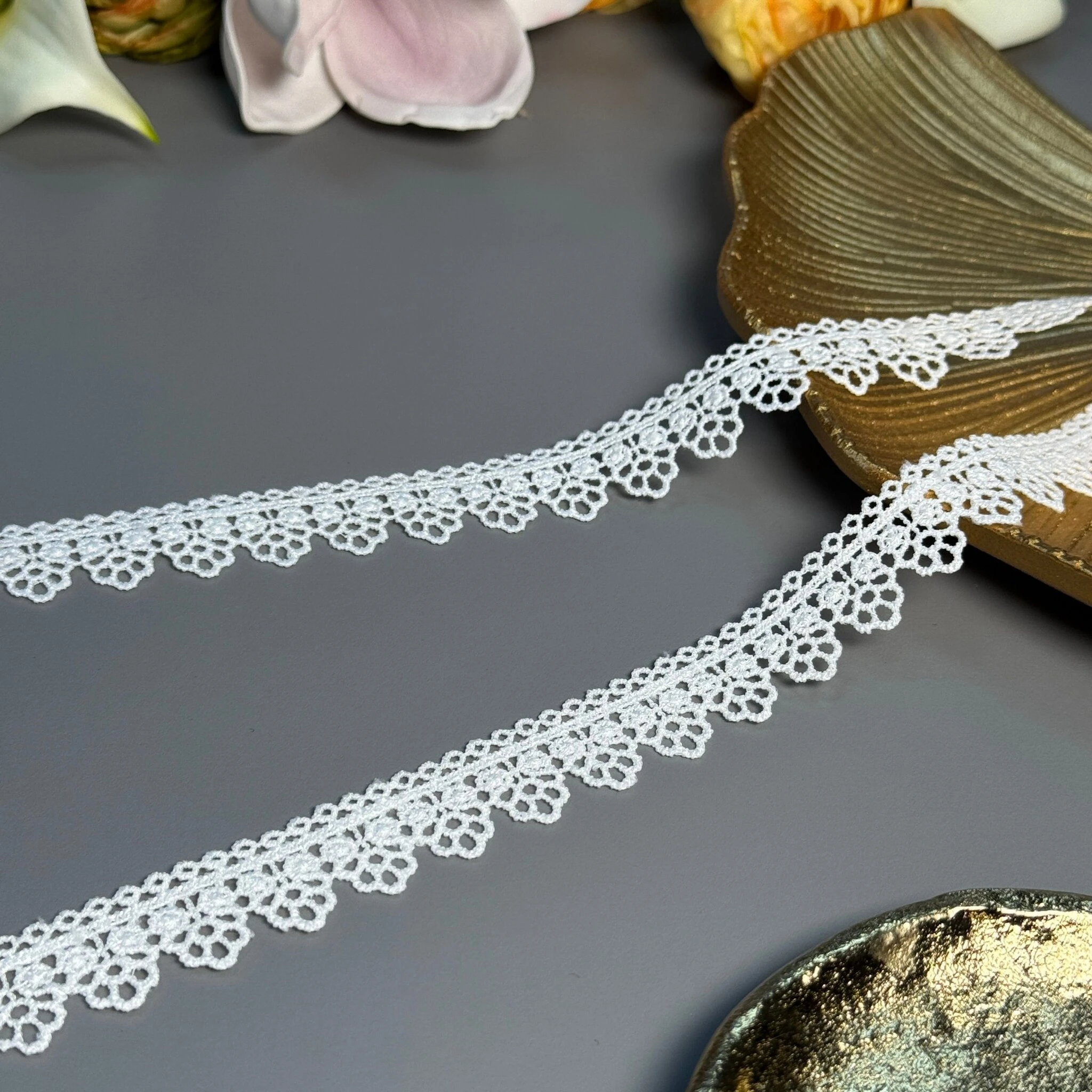 Мереживо поліестер – декоративний матеріал з синтетичного волокна, що відзначається високою зносостійкістю та стабільністю форми. Поліестер не схильний до деформацій, не розтягується і не мнеться, що робить мереживо придатним для частого використання.