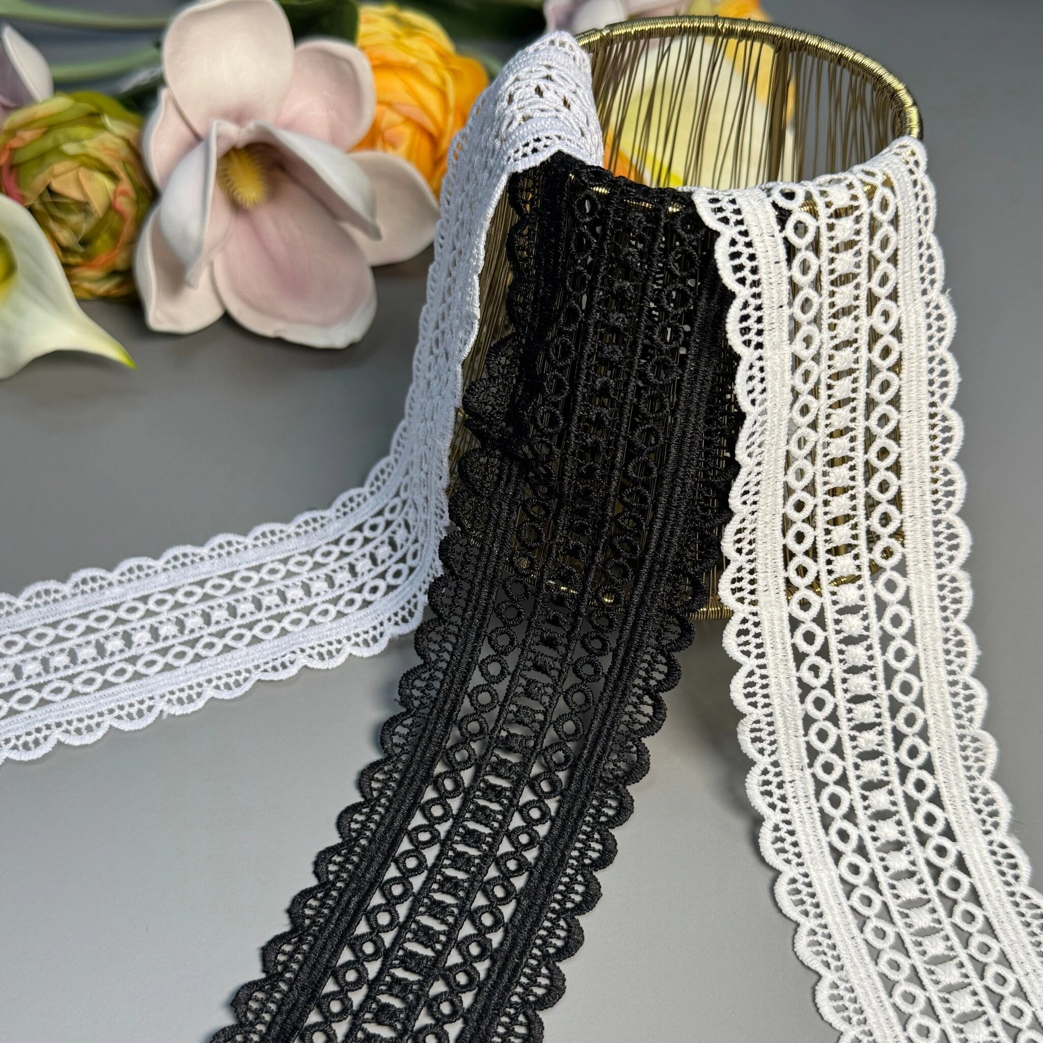 Мереживо поліестер – декоративний матеріал з синтетичного волокна, що відзначається високою зносостійкістю та стабільністю форми. Поліестер не схильний до деформацій, не розтягується і не мнеться, що робить мереживо придатним для частого використання.