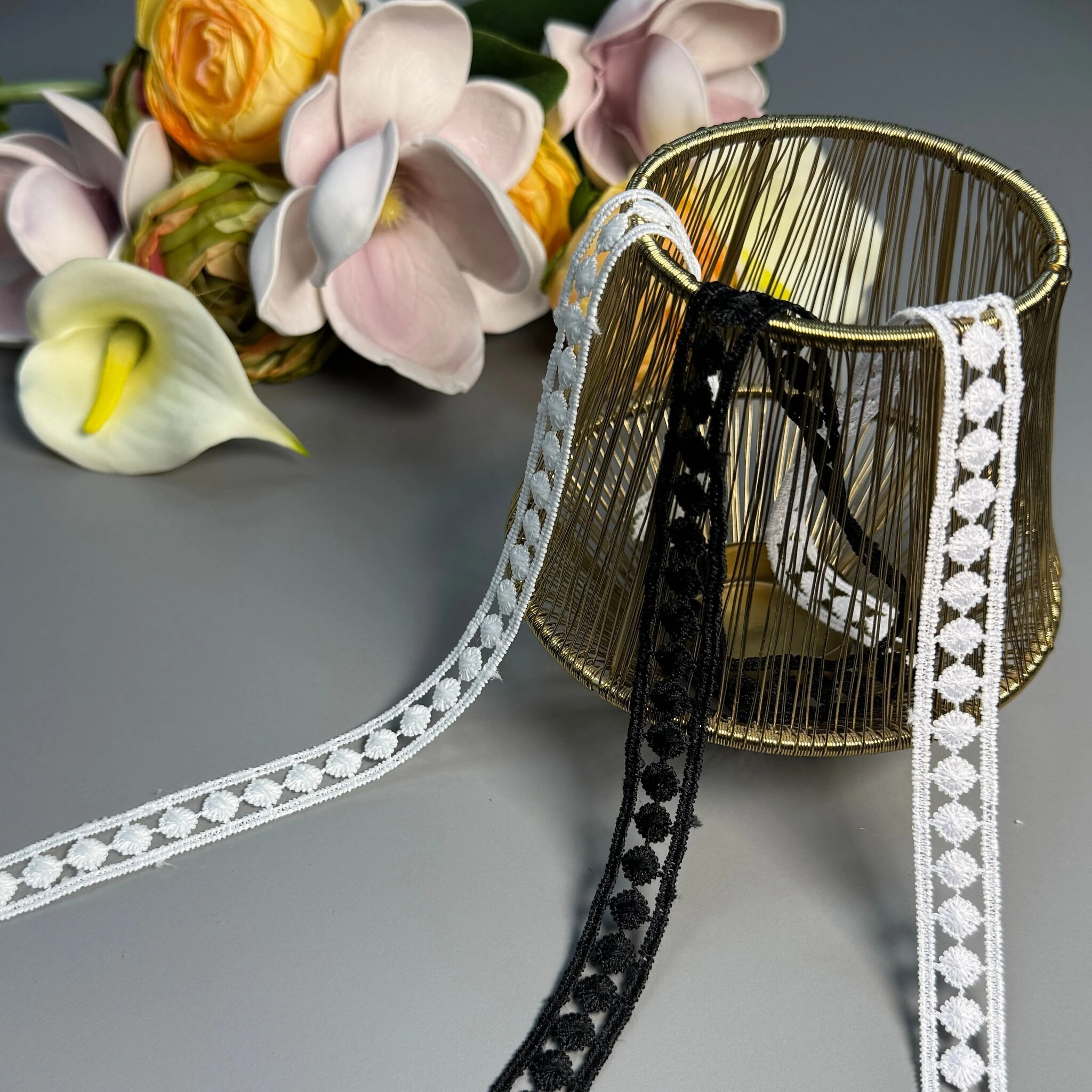 Мереживо поліестер – декоративний матеріал з синтетичного волокна, що відзначається високою зносостійкістю та стабільністю форми. Поліестер не схильний до деформацій, не розтягується і не мнеться, що робить мереживо придатним для частого використання.