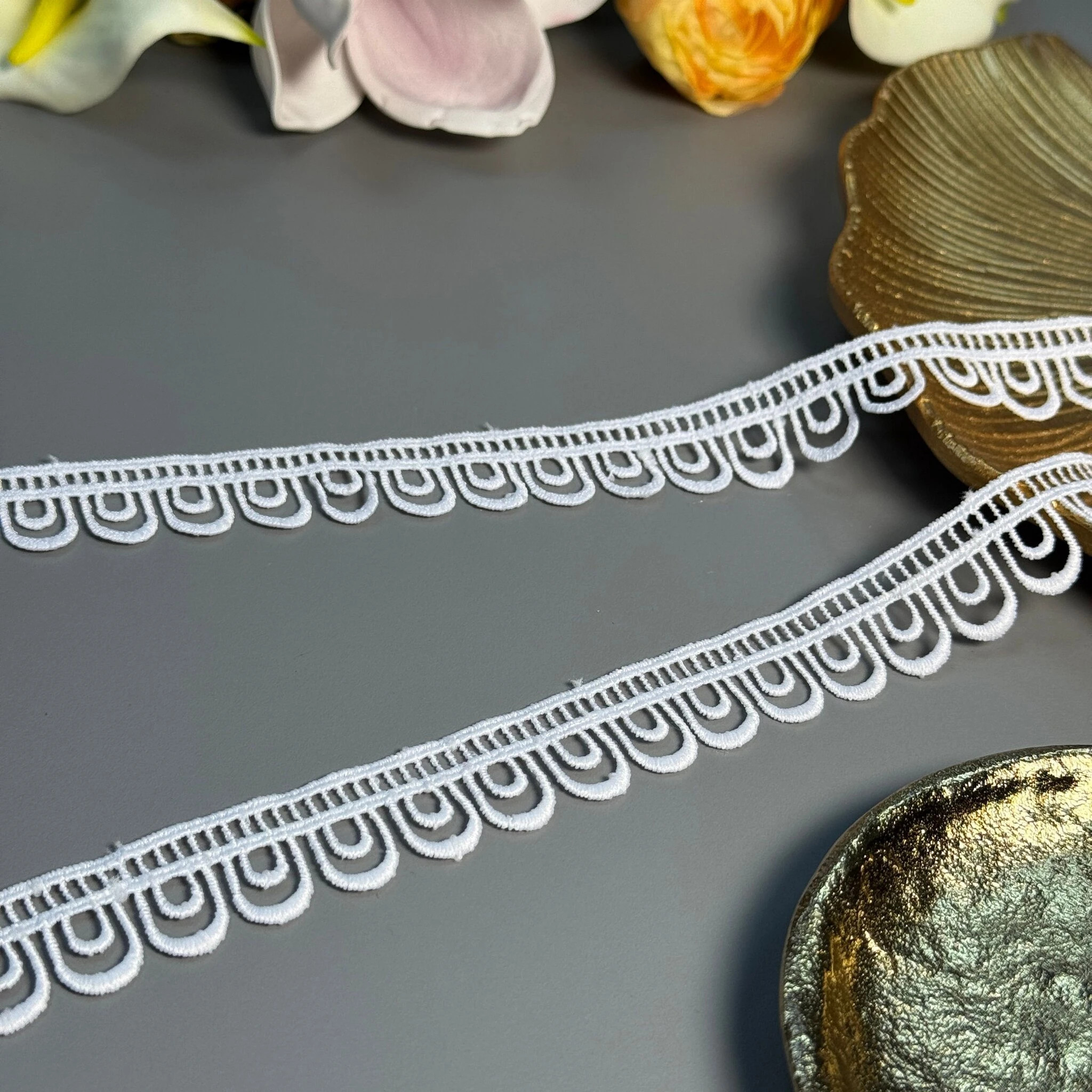 Мереживо поліестер – декоративний матеріал з синтетичного волокна, що відзначається високою зносостійкістю та стабільністю форми. Поліестер не схильний до деформацій, не розтягується і не мнеться, що робить мереживо придатним для частого використання.
