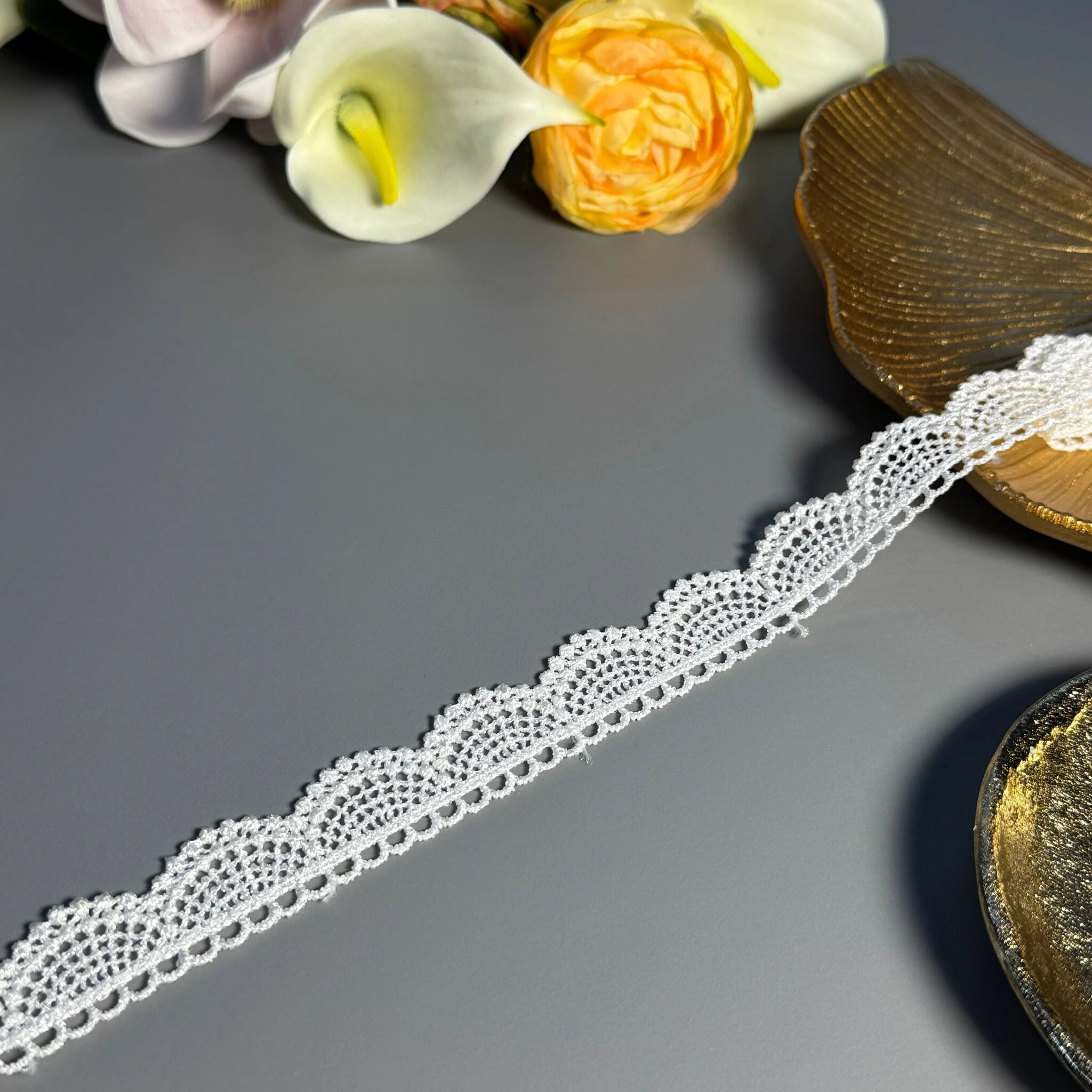 Мереживо поліестер – декоративний матеріал з синтетичного волокна, що відзначається високою зносостійкістю та стабільністю форми. Поліестер не схильний до деформацій, не розтягується і не мнеться, що робить мереживо придатним для частого використання.