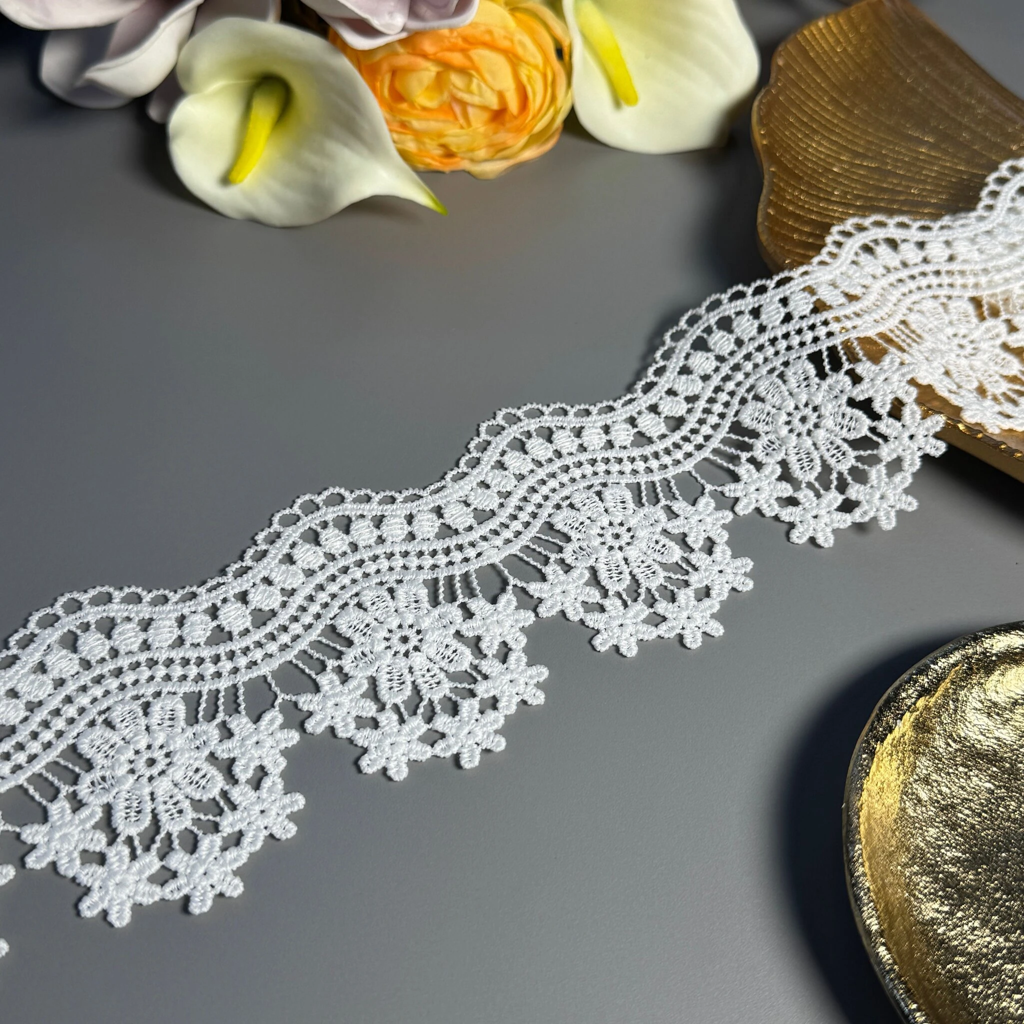 Мереживо поліестер – декоративний матеріал з синтетичного волокна, що відзначається високою зносостійкістю та стабільністю форми. Поліестер не схильний до деформацій, не розтягується і не мнеться, що робить мереживо придатним для частого використання.