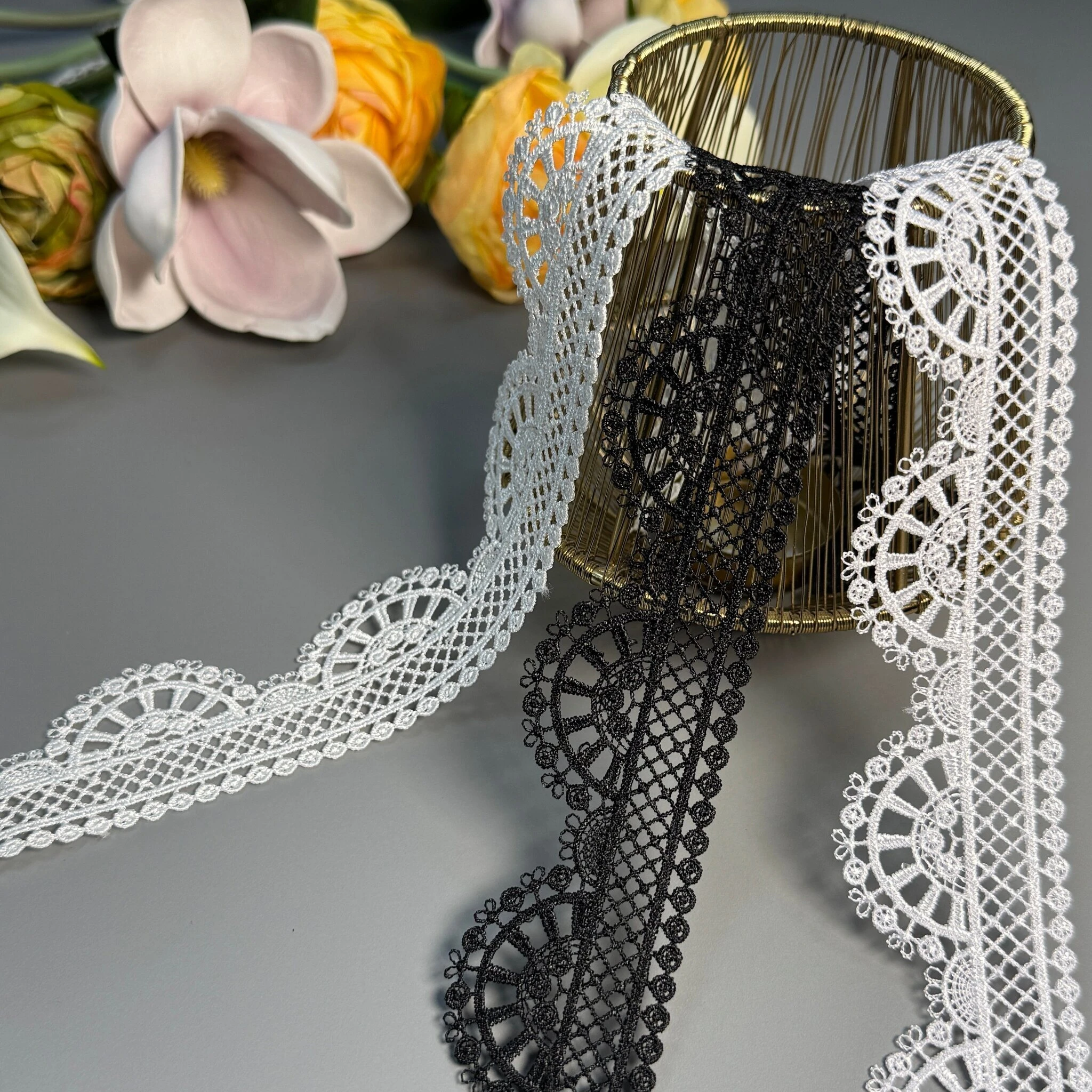 Мереживо поліестер – декоративний матеріал з синтетичного волокна, що відзначається високою зносостійкістю та стабільністю форми. Поліестер не схильний до деформацій, не розтягується і не мнеться, що робить мереживо придатним для частого використання.