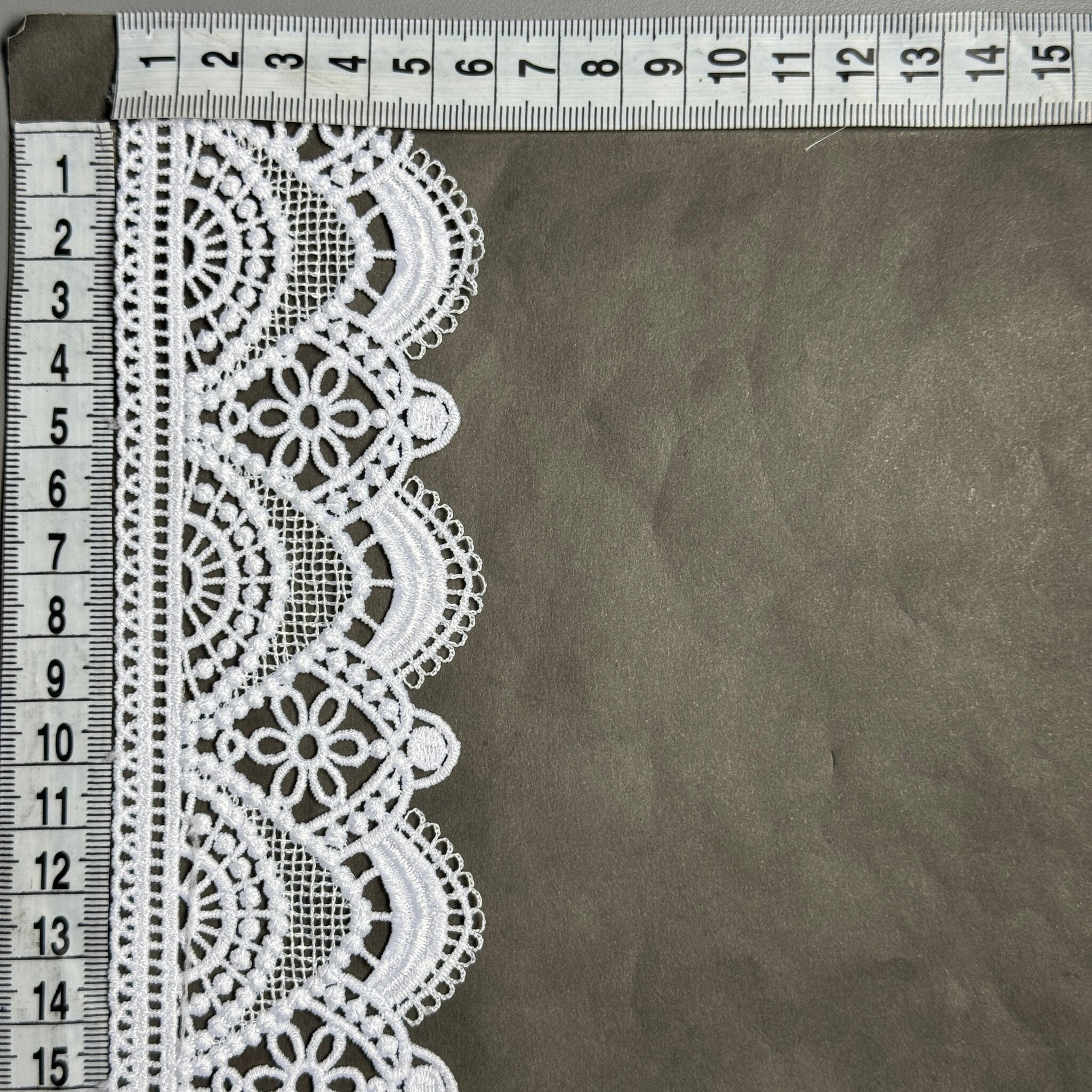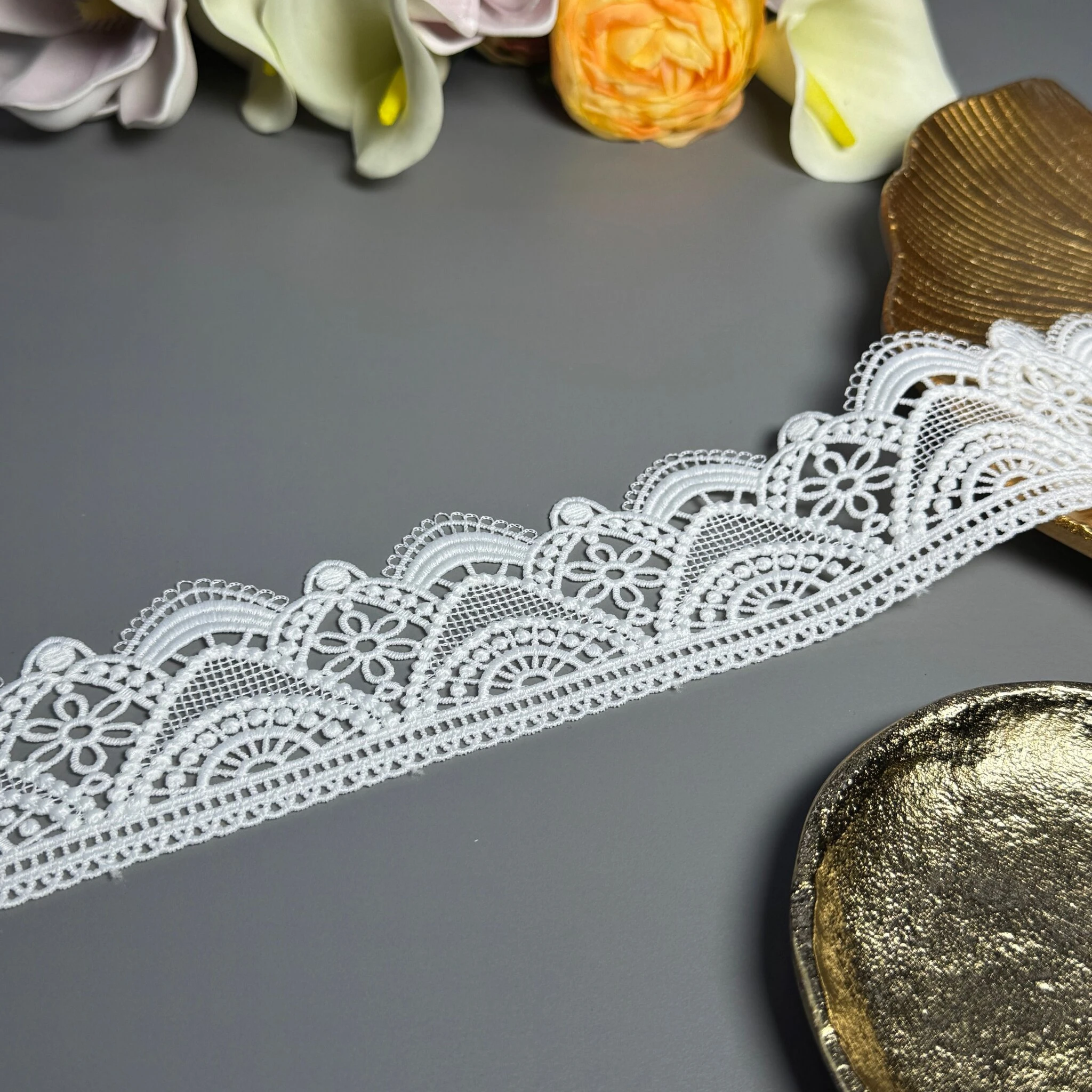 Мереживо поліестер – декоративний матеріал з синтетичного волокна, що відзначається високою зносостійкістю та стабільністю форми. Поліестер не схильний до деформацій, не розтягується і не мнеться, що робить мереживо придатним для частого використання.