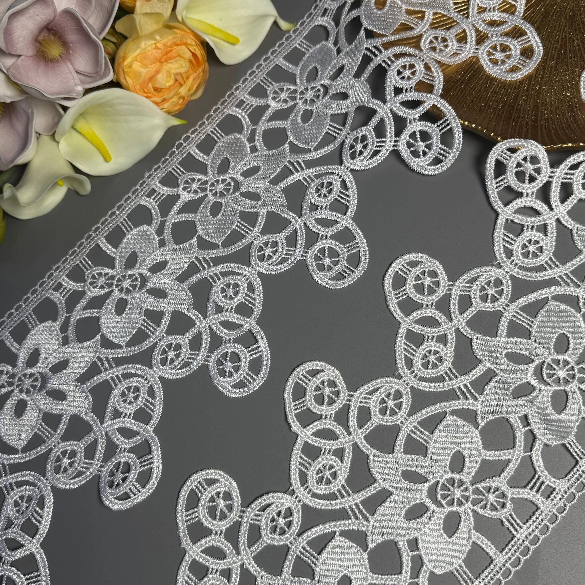 Мереживо поліестер – декоративний матеріал з синтетичного волокна, що відзначається високою зносостійкістю та стабільністю форми. Поліестер не схильний до деформацій, не розтягується і не мнеться, що робить мереживо придатним для частого використання.