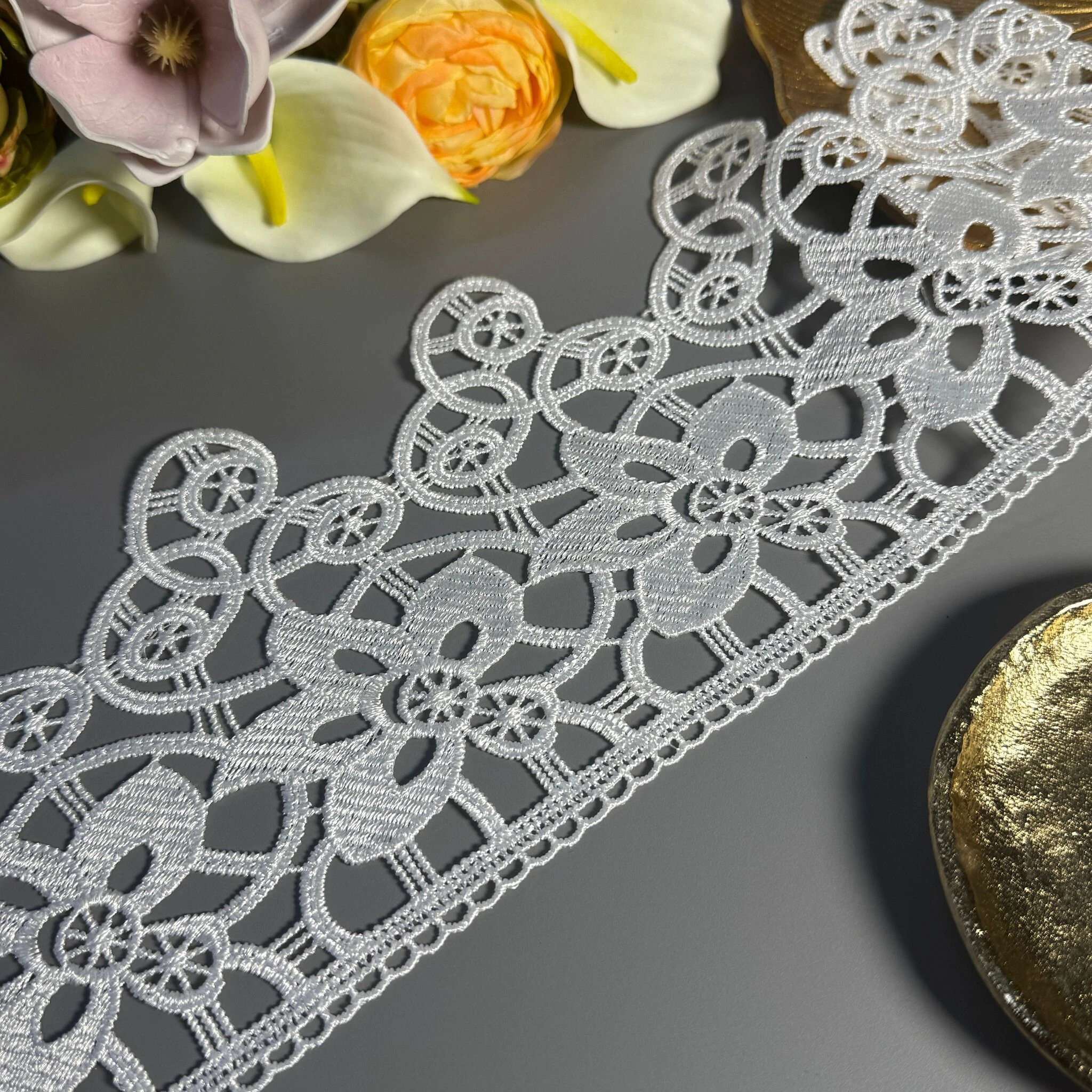 Мереживо поліестер – декоративний матеріал з синтетичного волокна, що відзначається високою зносостійкістю та стабільністю форми. Поліестер не схильний до деформацій, не розтягується і не мнеться, що робить мереживо придатним для частого використання.