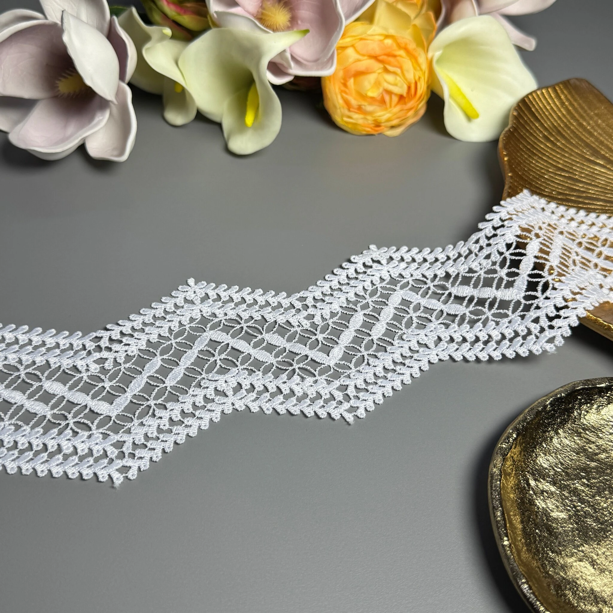 Мереживо поліестер – декоративний матеріал з синтетичного волокна, що відзначається високою зносостійкістю та стабільністю форми. Поліестер не схильний до деформацій, не розтягується і не мнеться, що робить мереживо придатним для частого використання.