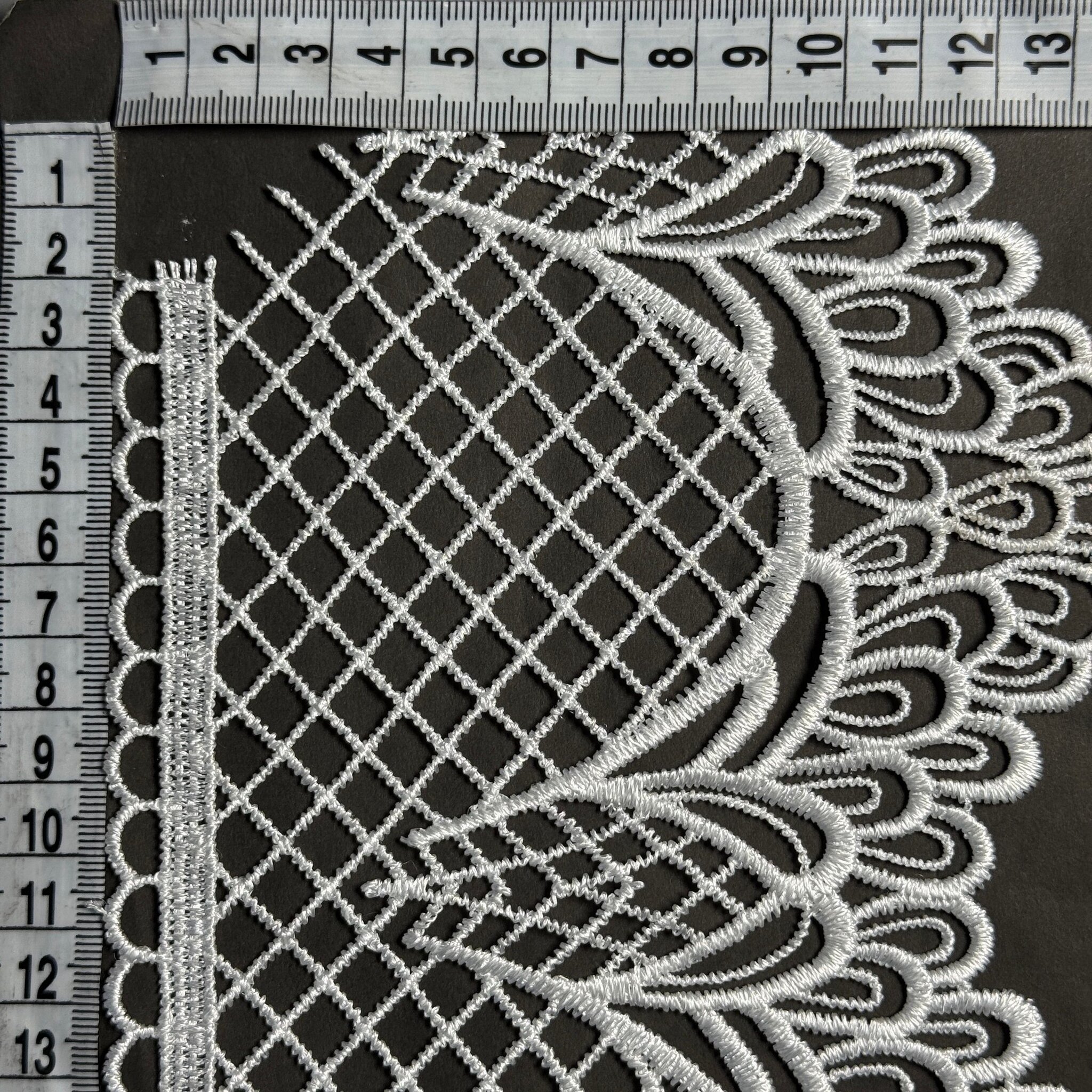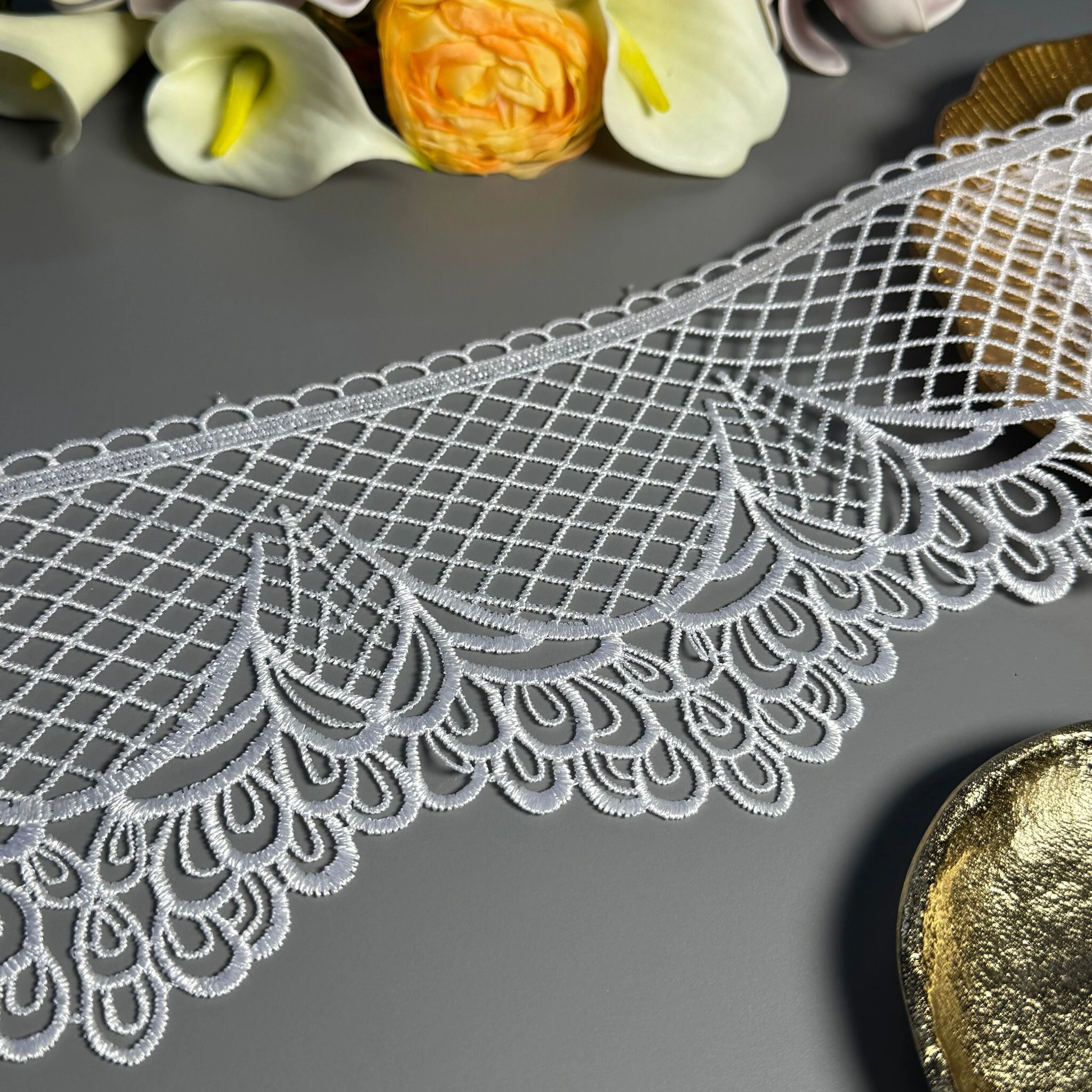 Мереживо поліестер – декоративний матеріал з синтетичного волокна, що відзначається високою зносостійкістю та стабільністю форми. Поліестер не схильний до деформацій, не розтягується і не мнеться, що робить мереживо придатним для частого використання.