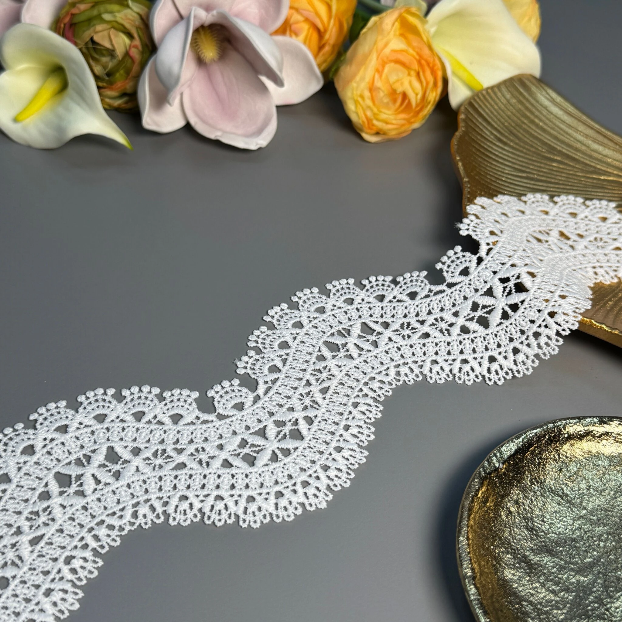 Мереживо поліестер – декоративний матеріал з синтетичного волокна, що відзначається високою зносостійкістю та стабільністю форми. Поліестер не схильний до деформацій, не розтягується і не мнеться, що робить мереживо придатним для частого використання.