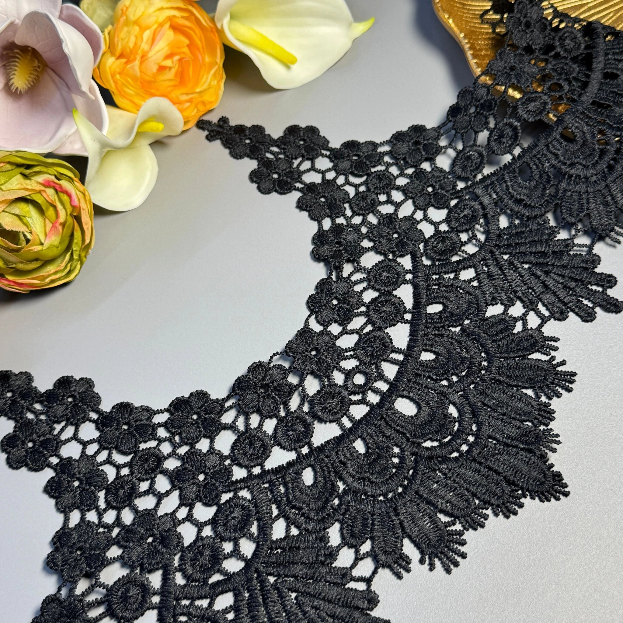 Мереживо поліестер – декоративний матеріал з синтетичного волокна, що відзначається високою зносостійкістю та стабільністю форми. Поліестер не схильний до деформацій, не розтягується і не мнеться, що робить мереживо придатним для частого використання.