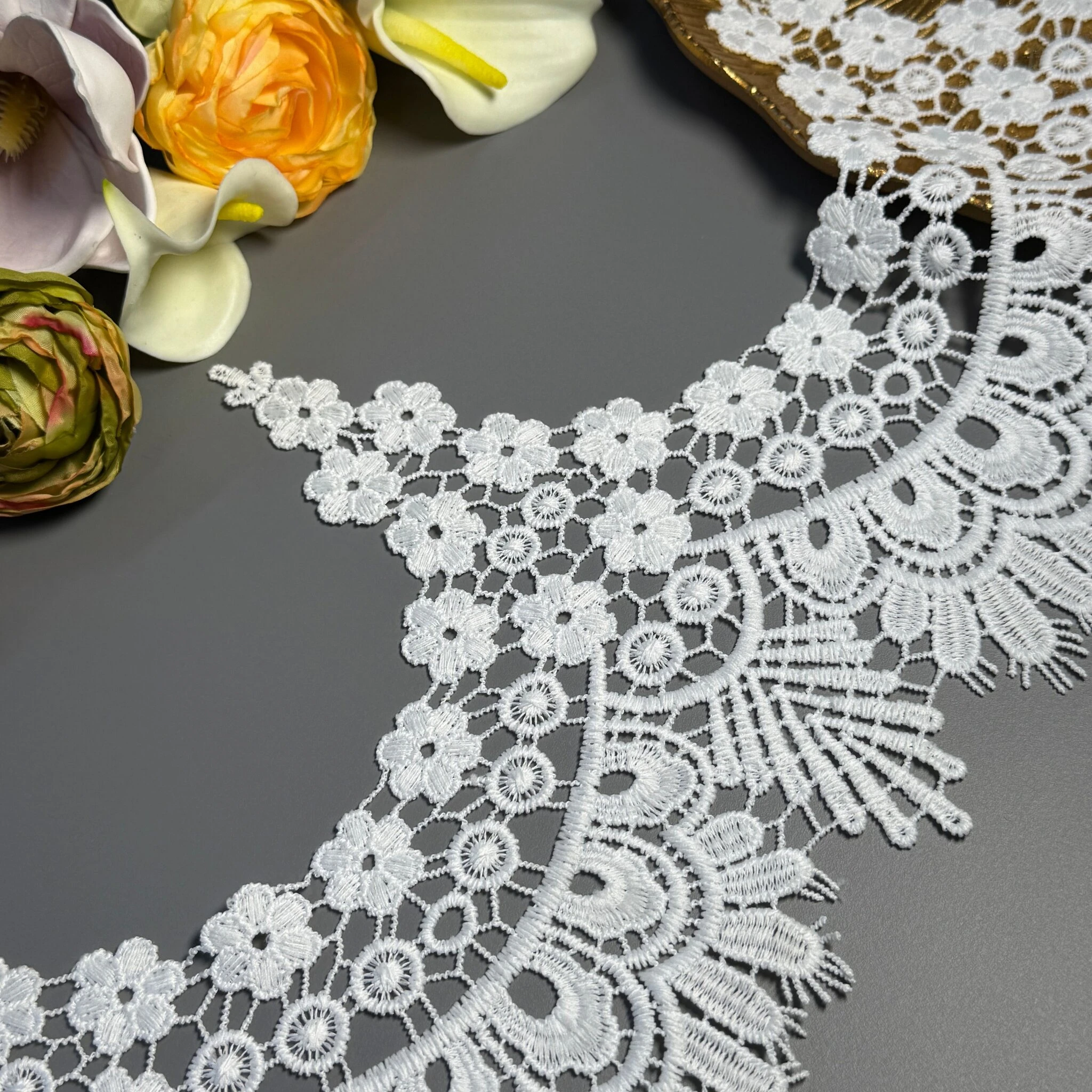 Мереживо поліестер – декоративний матеріал з синтетичного волокна, що відзначається високою зносостійкістю та стабільністю форми. Поліестер не схильний до деформацій, не розтягується і не мнеться, що робить мереживо придатним для частого використання.