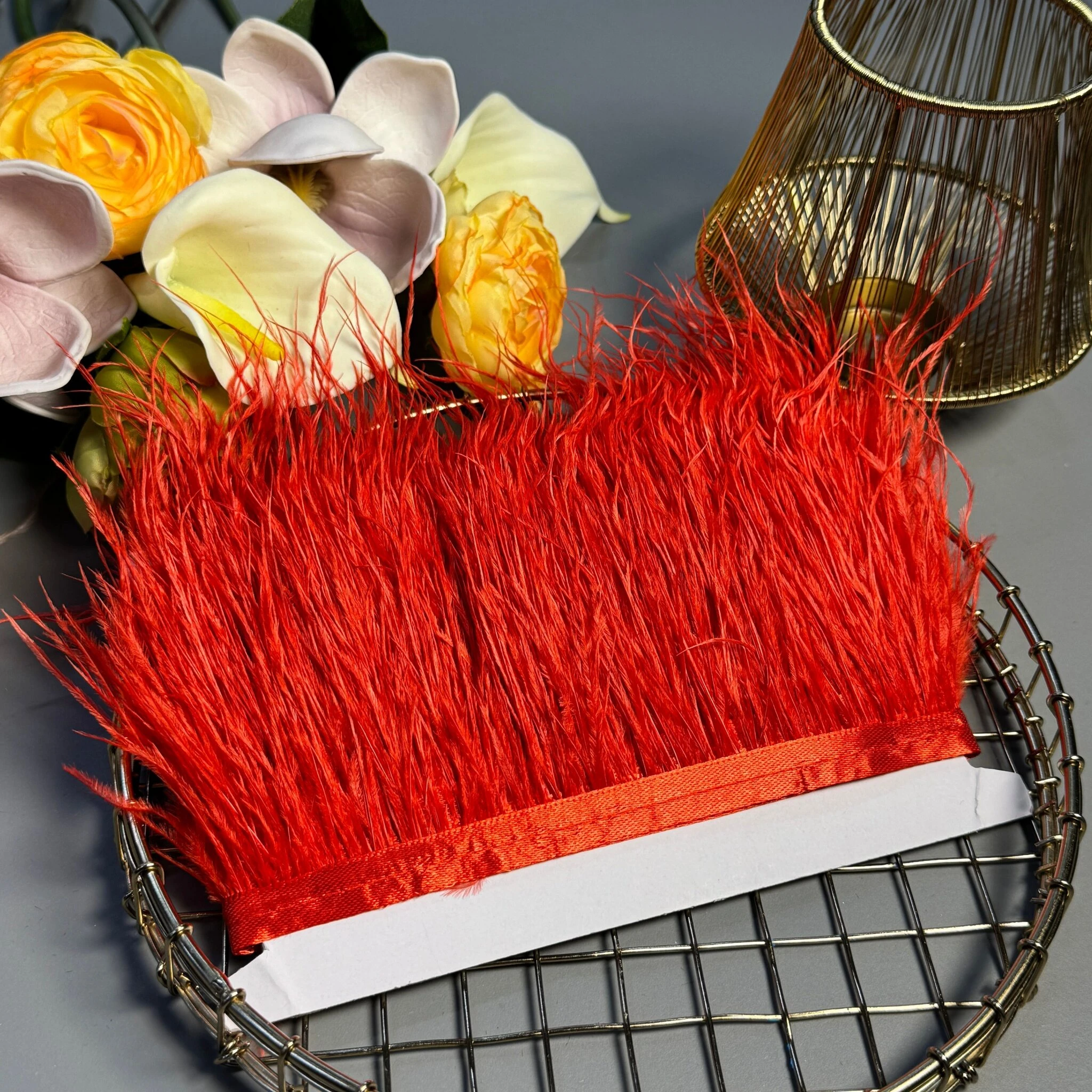 Пір’я на тасьмі 7–10 см, 10 метрів – декоративна стрічка з натуральними або штучними пір’ям довжиною 7–10 см, змонтованими на текстильній основі.