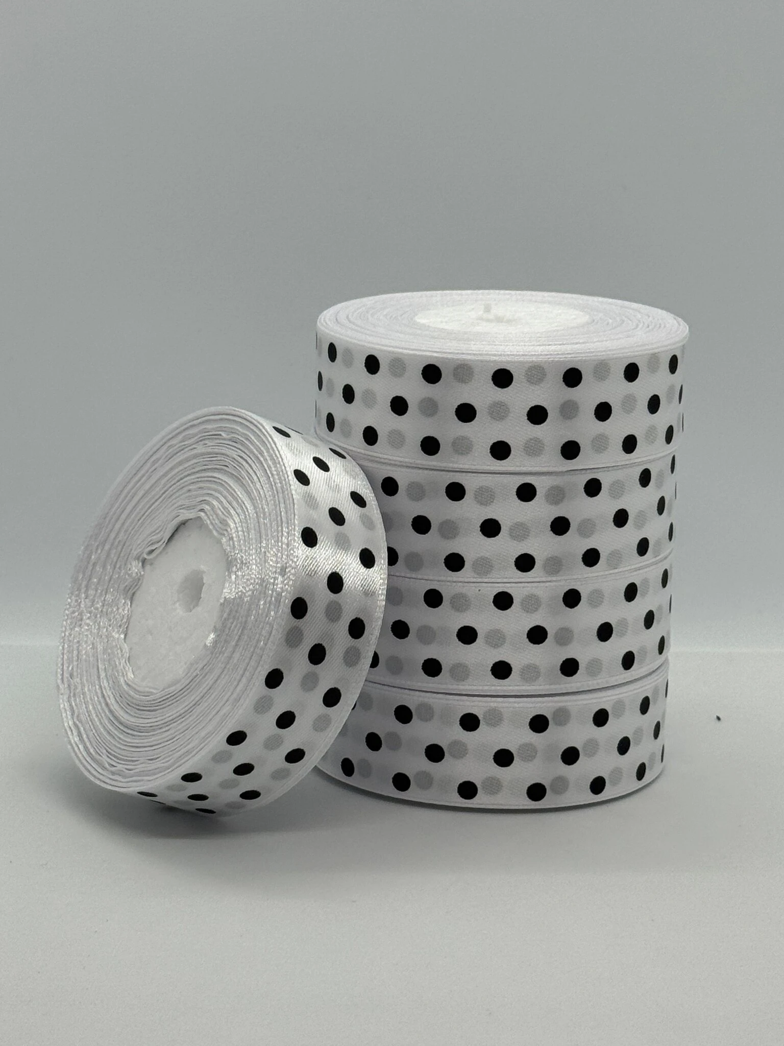 Стрічка атласна в горох 2.5 см (5*36 ярдів), 01 білий + чорний