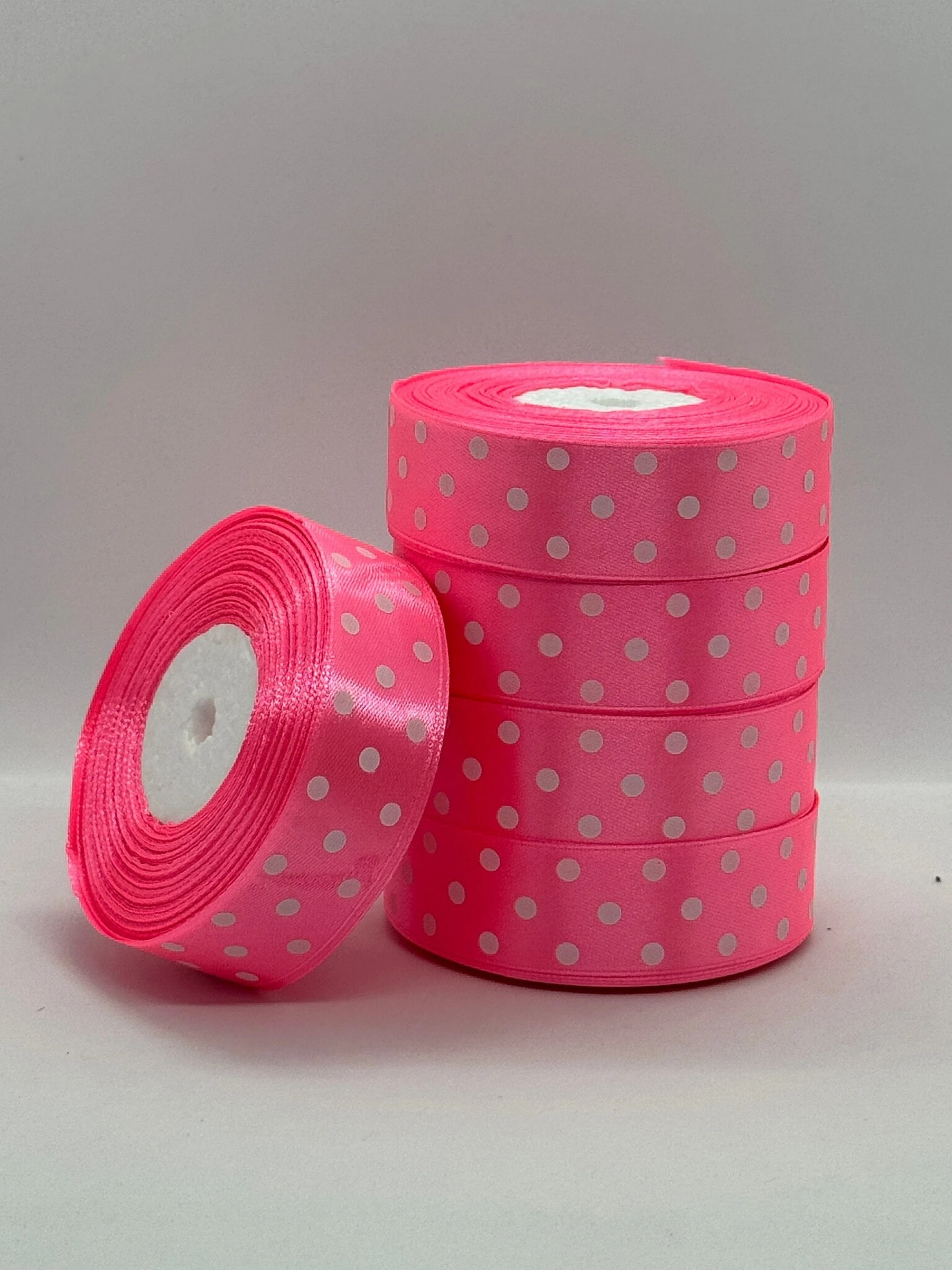 Стрічка атласна в горох 2.5 см (5*36 ярдів), 05 рожевий + білий