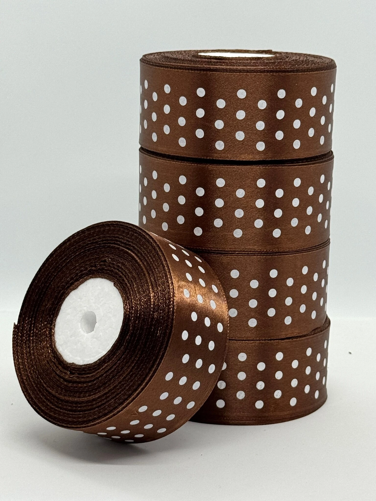 Стрічка атласна в горох 4 см (5*36 ярдів), 32 коричневий + білий