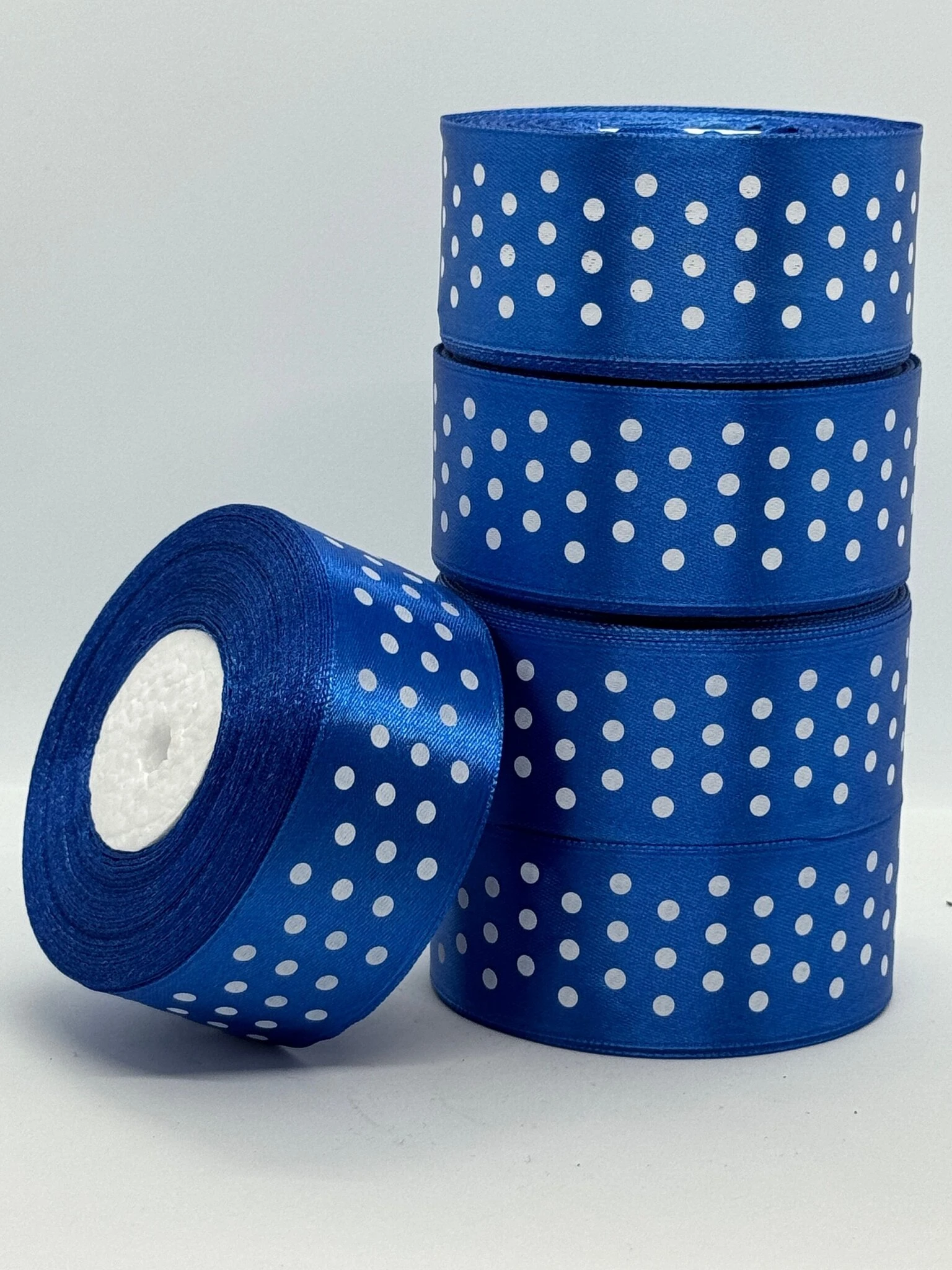 Стрічка атласна в горох 4 см (5*36 ярдів), 40 електрик + білий